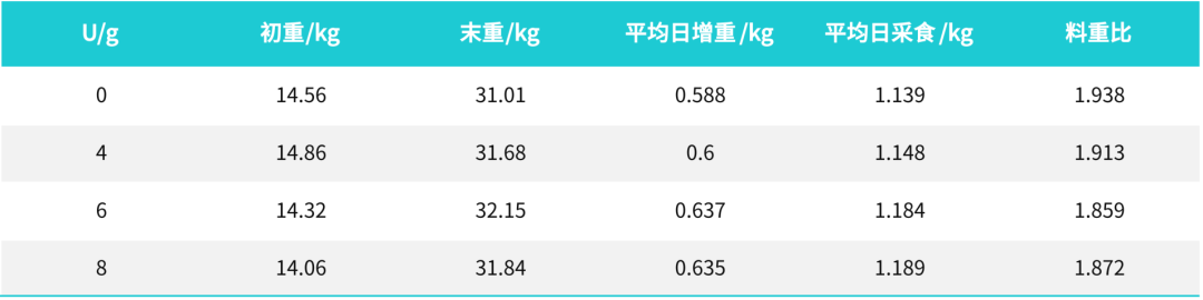 96头三元杂交(杜x长x大)仔猪,随机分为4组,每组4个重复,每个重复6头猪,公母各半。对照组饲喂基础日粮,试验一、二、三组分别添加 溢多利 新型蛋白酶,达到4U/g、6U/g、8U/g。试验周期28天。