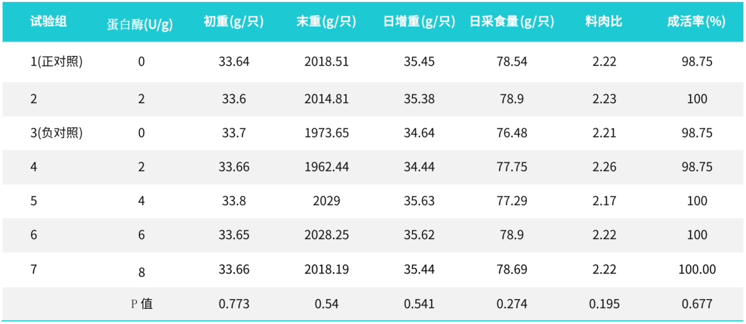 从上表可以看出,在降低相对值5%粗蛋白的条件下,与正对照组相比,生长性能有所下降;在负对照的基础上添加 溢多利 新型蛋白酶(4U/g,6U/g,8U/g),可以达到正对照组的水平。
