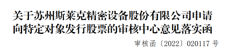 2022年6月1日,斯莱克发布2022年度创业板向特定对象发行股票募集说明书(二次修订稿)。斯莱克本次向特定对象发行股票募集资金总额不超过83748.00万元(含本数),并以中国证监会关于本次发行的注册批复文件为准。本次发行的募集资金在扣除发行费用后,将用于苏州铝瓶高速自动化生产线制造项目、常州电池壳生产项目、泰安设备产线基地建设项目、海南高端装备制造及研发中心项目。