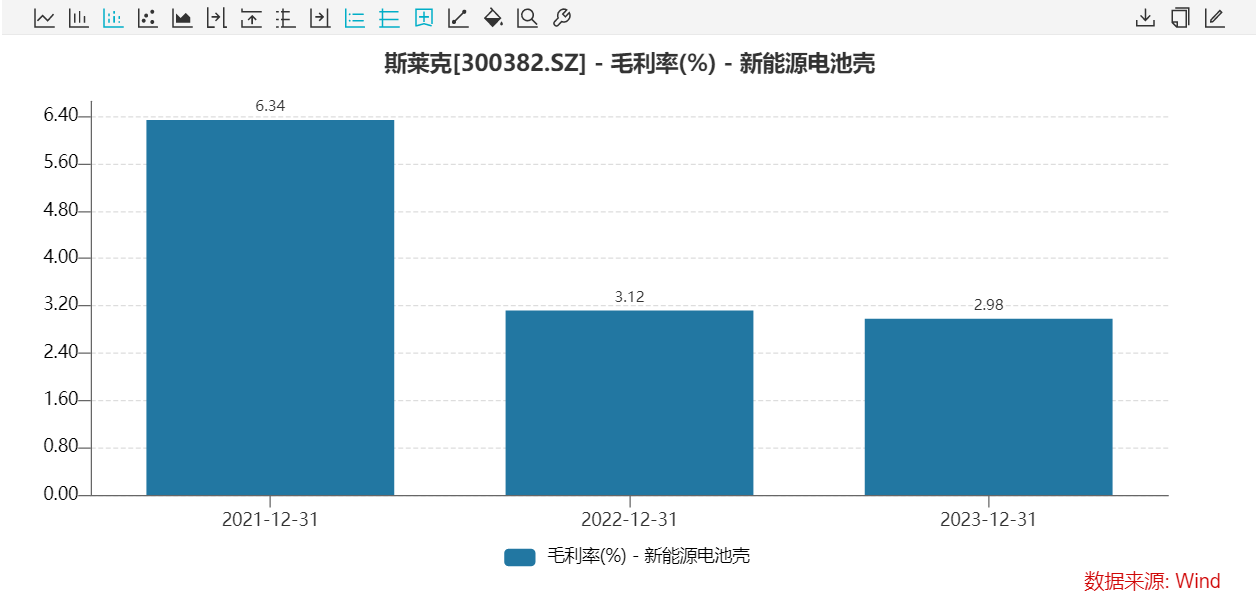 数据显示,2021年至2023年,斯莱克新能源电池壳的毛利率分别为6.34%、3.12%和2.98%。2024年上半年,斯莱克电池壳业务的毛利率仅为0.06%,同比下降4.96个百分点,这意味着电池壳业务每实现100元的营收,斯莱克仅能获取0.06元的微薄毛利。