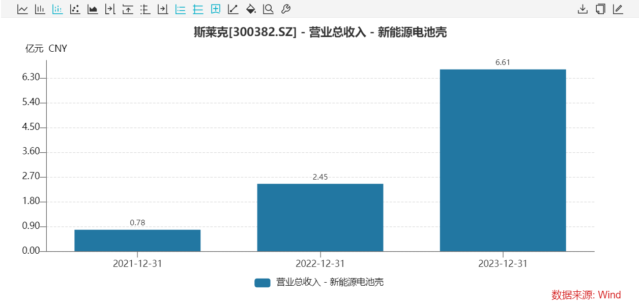 经过多年努力,斯莱克的电池壳业务在市场规模上取得了显著增长。2021年至2023年,该业务板块分别创造了0.78亿元、2.45亿元和6.61亿元的营业收入,占公司总营业收入的比例逐年攀升,分别为7.81%、14.13%和40.00%。