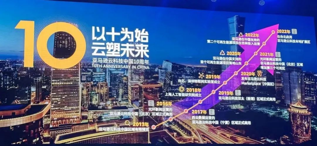 2023年是亚马逊云科技植根中国的第十年和亚马逊云科技中国峰会落地中国的第九年。在27日上午主会场演讲的最后,亚马逊全球副总裁、亚马逊云科技大中华区执行董事张文翊女士宣布了亚马逊云科技十周年纪念活动启动。光环新网总裁耿岩先生受邀上台,与亚马逊主要合作伙伴和技术创建者嘉宾一起共同发布和见证了亚马逊云科技十周年点亮活动。