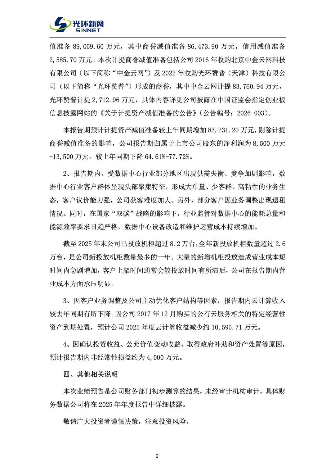 1)经第六届董事会 2026 年第一次会议审议通过,本报告期预计计提资产减值准备 89,059.60 万元,其中商誉减值准备 86,473.90 万元,信用减值准备 2,585.70 万元。本次计提商誉减值准备包括 2016 年收购北京中金云网科技有限公司(以下简称“中金云网”)及 2022 年收购光环赞普(天津)科技有限公司(以下简称“光环赞普”)形成的商誉,其中中金云网计提 83,760.94 万元,光环赞普计提 2,712.96 万元。