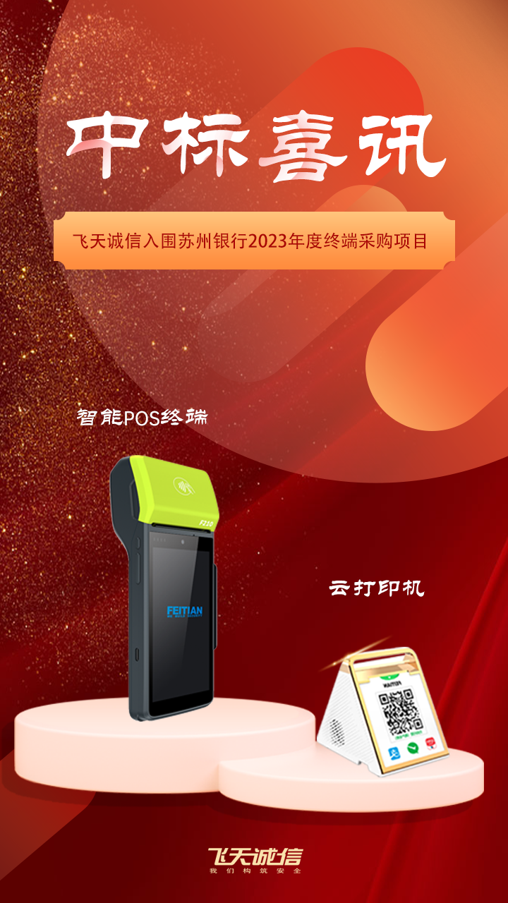 近日,苏州银行公示了2023年度智能POS机、云打印机设备采购项目评标结果,飞天诚信智能POS、云打印机两款产品在经过严格的POC测试和多层筛选后成功入围,为银行收单业务创新加码。