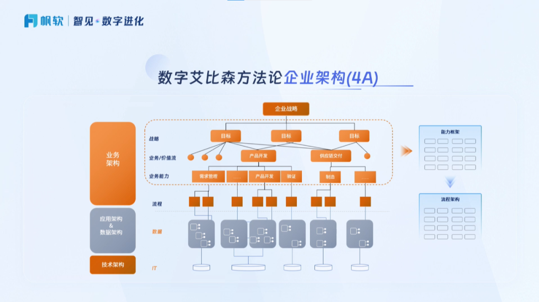 价值流清楚了以后,我们就非常清楚从价值流导出我们需要什么样的业务能力,也就是能力框架,基于能力框架,下一步是要去做系统应用,中间就需要把能力框架转化成流程框架,因为我们需要通过流程来承载你的业务能力,然后再去通过应用系统承载我们的流程,在应用系统之内需要去做的是数据的结构化,是数据的架构。在最底层有一个基础的技术架构来承接,这才是一个完完整整的从企业经营到数字化建设的过程。
