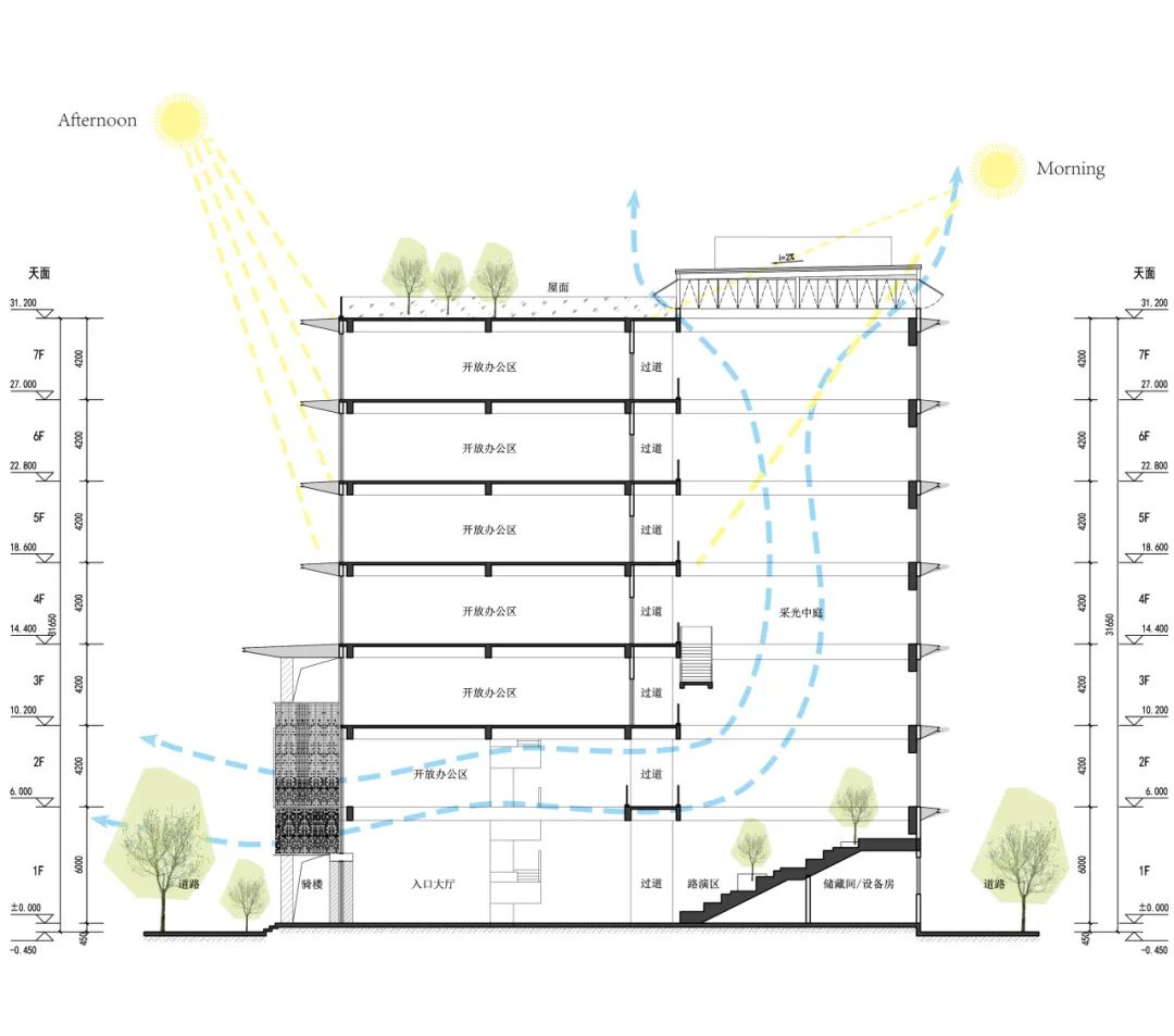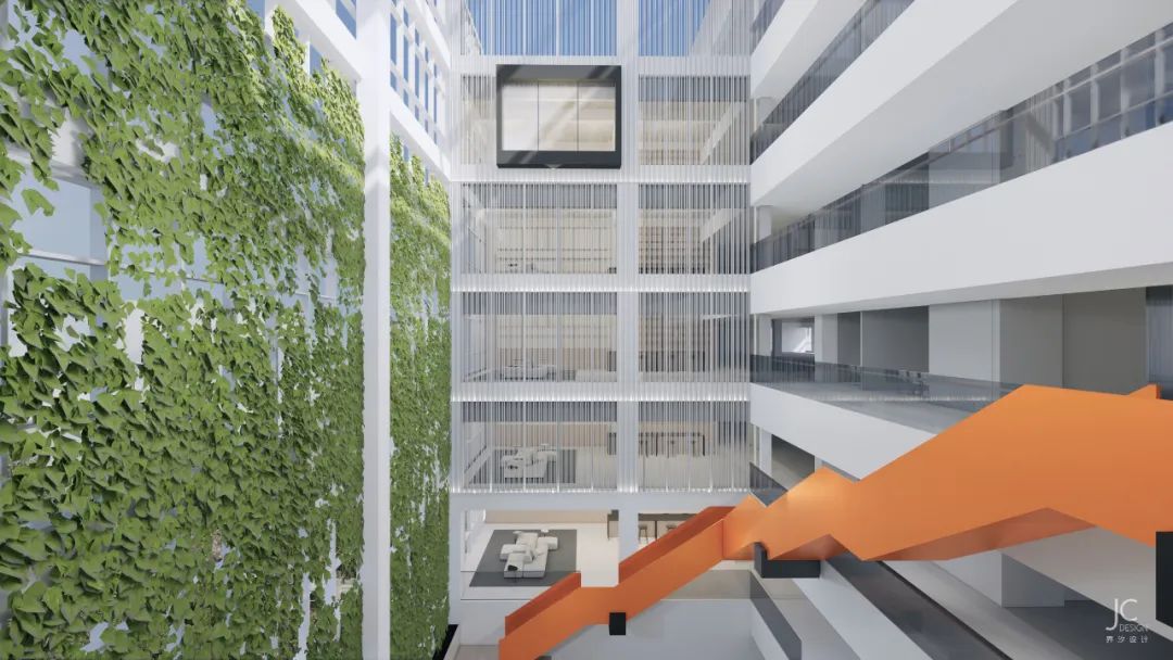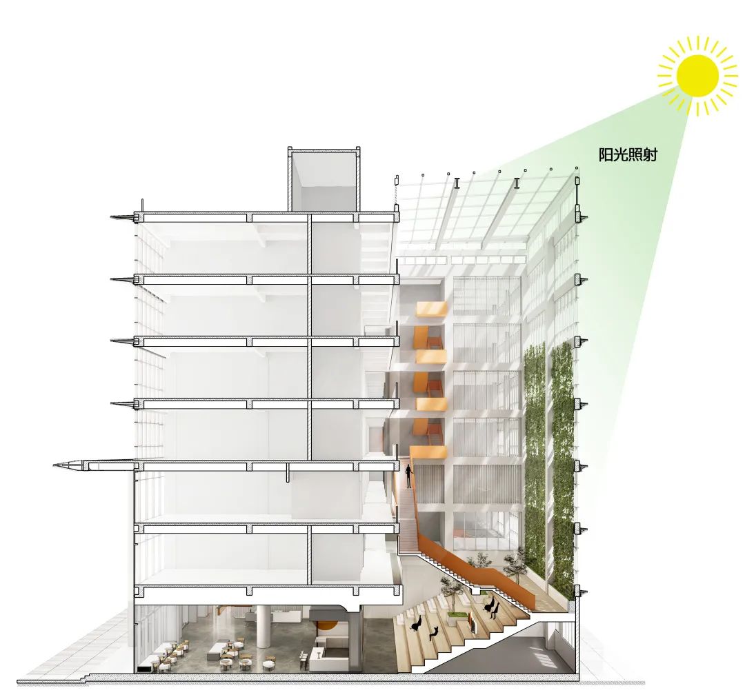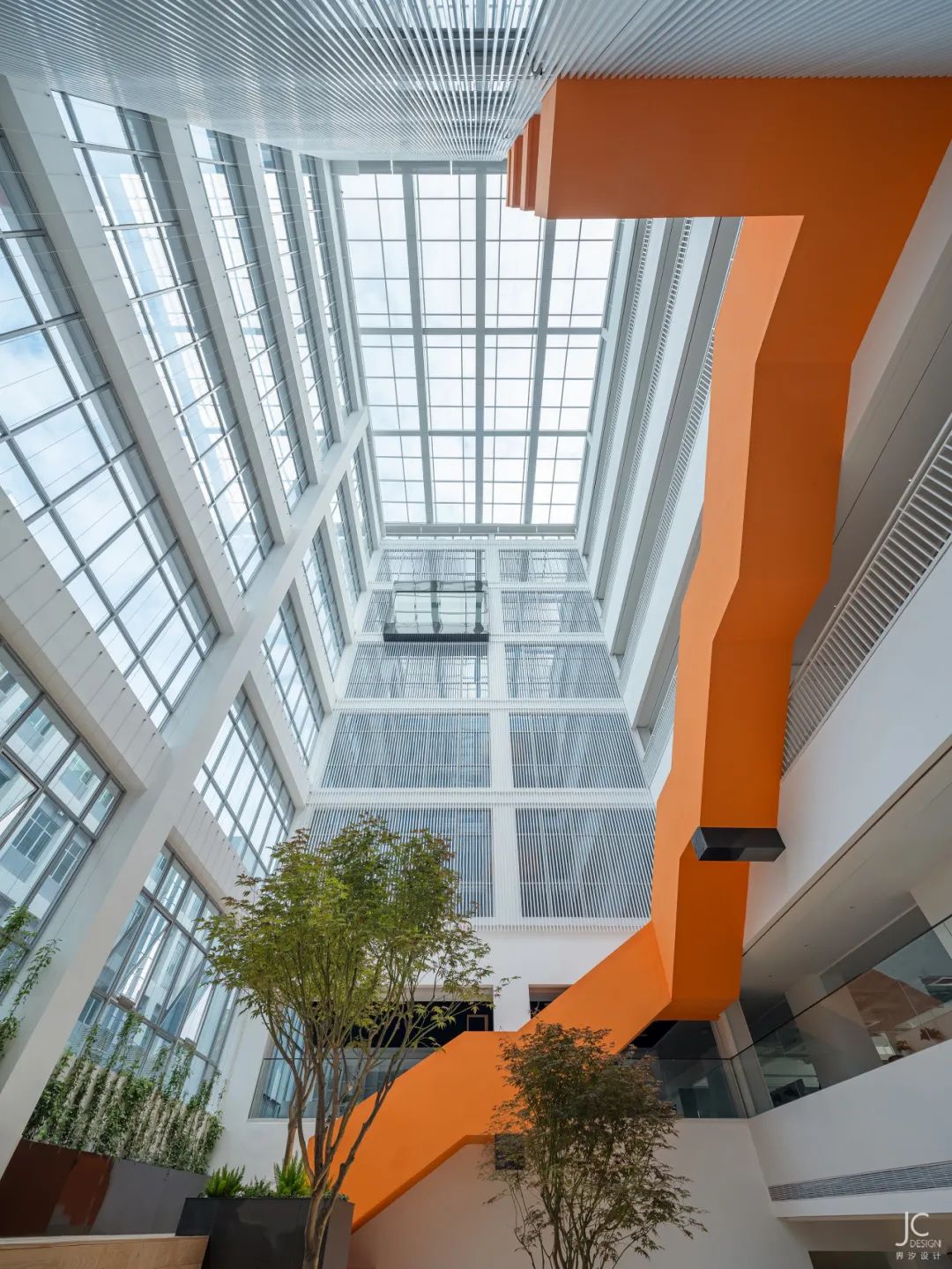 设计师将建筑中庭直通屋面,自然的风通过开启的屋顶,贯穿整个建筑,形成冷巷效应,散热降温,使空调系统在最佳状态下运作,降低实际运行能耗,有效改善建筑内部环境的微气候,打造一座“会呼吸”的建筑。