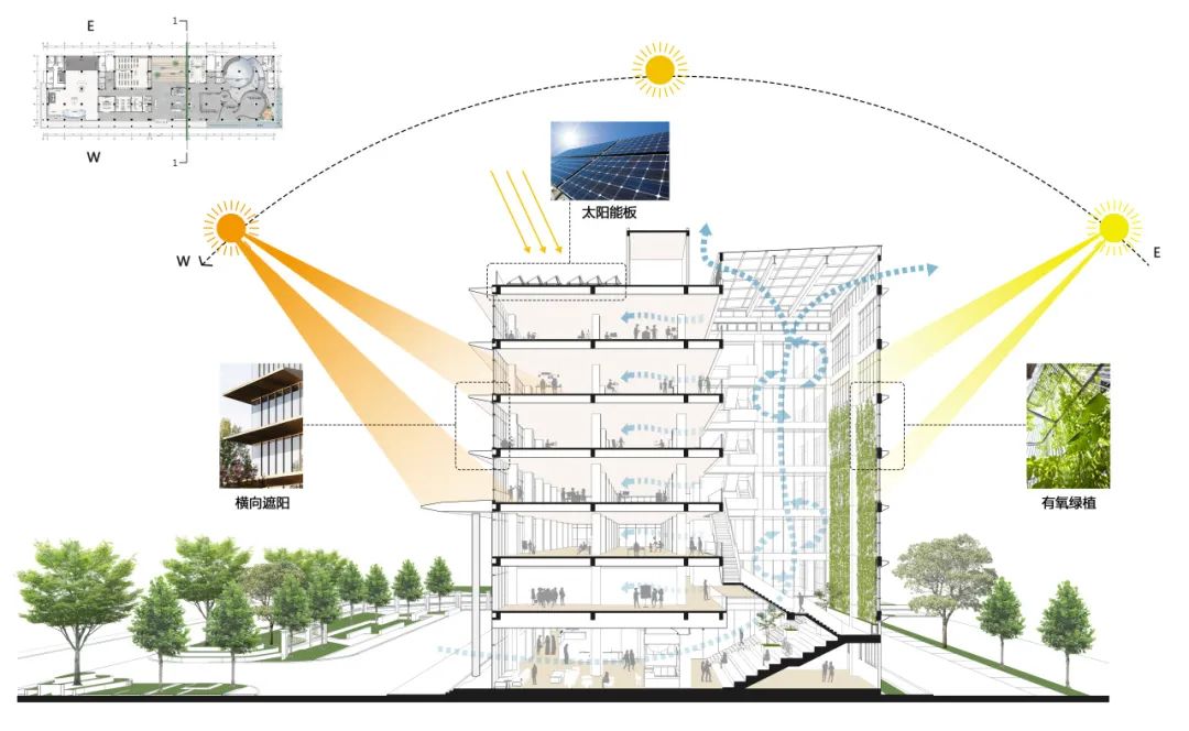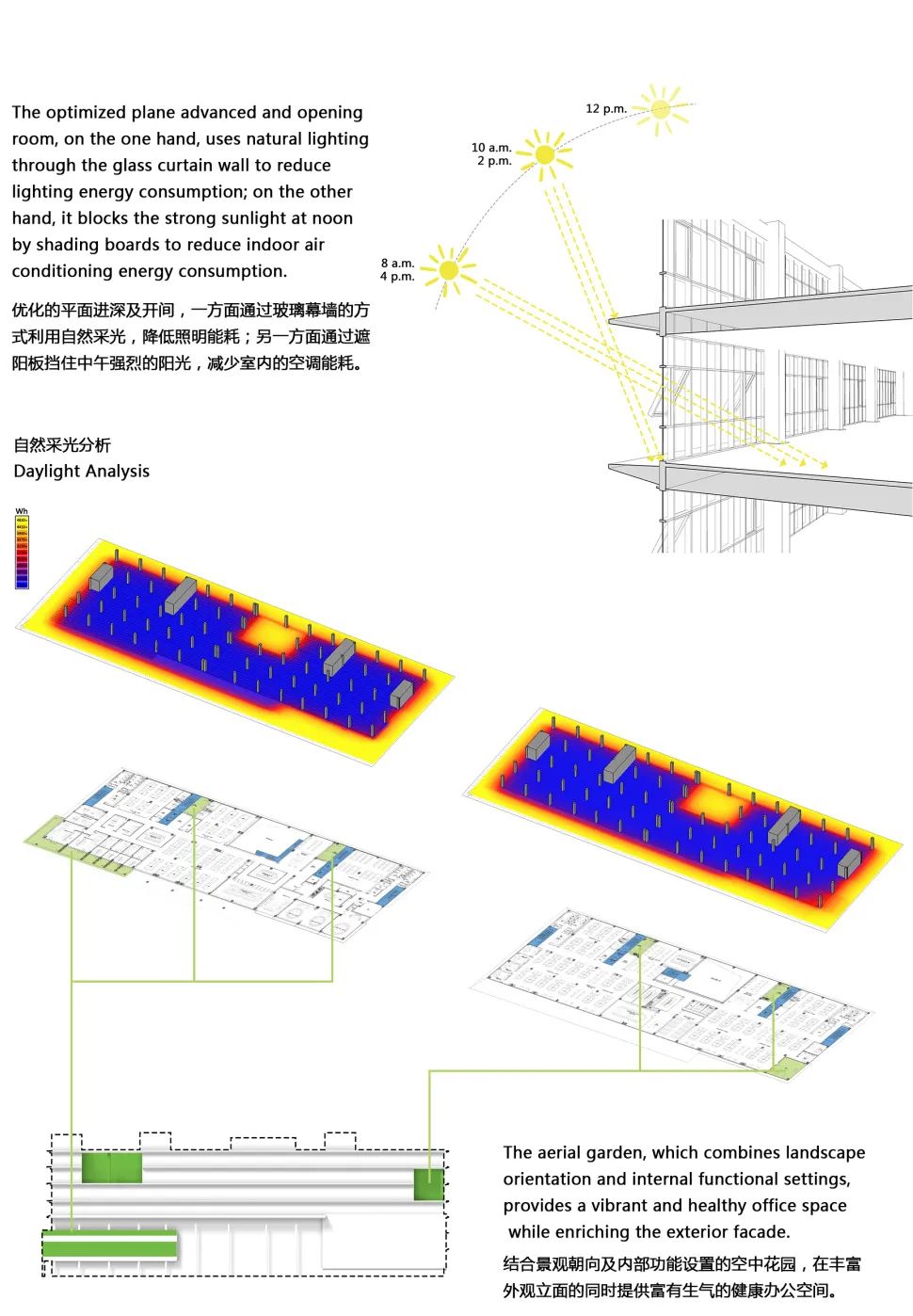 建筑西侧办公区透过玻璃幕墙利用自然采光,降低照明能耗;而横向的铝板,挡住了大部分强烈的阳光,减少室内太阳辐射,避免了阳光的直射,大幅降低建筑整体的冷却系统负载,改善室内热环境,有效降低建筑能耗。