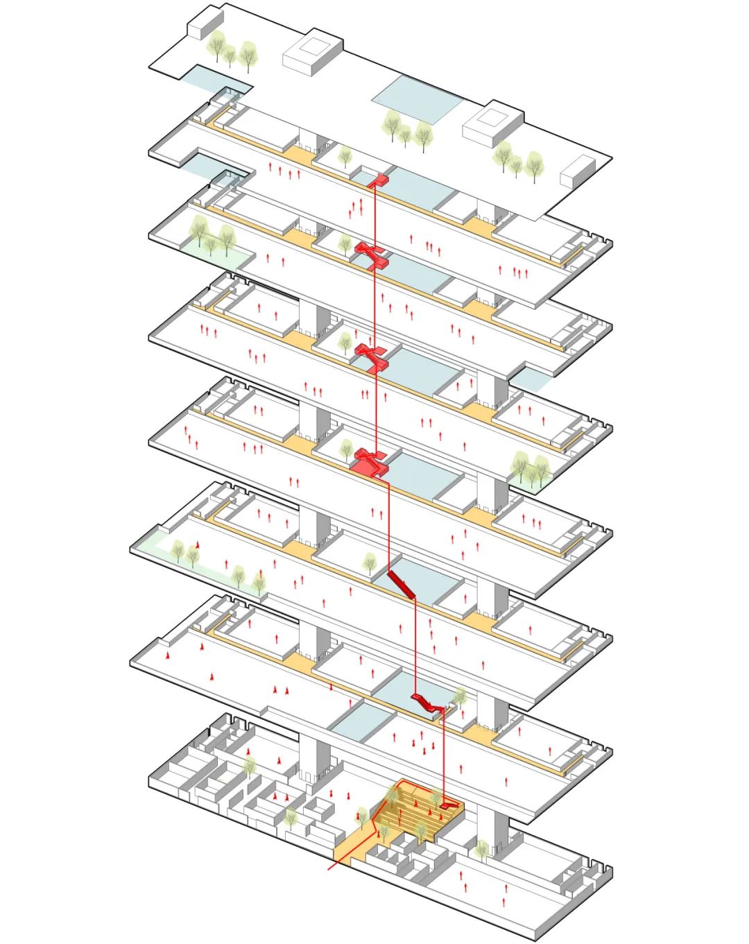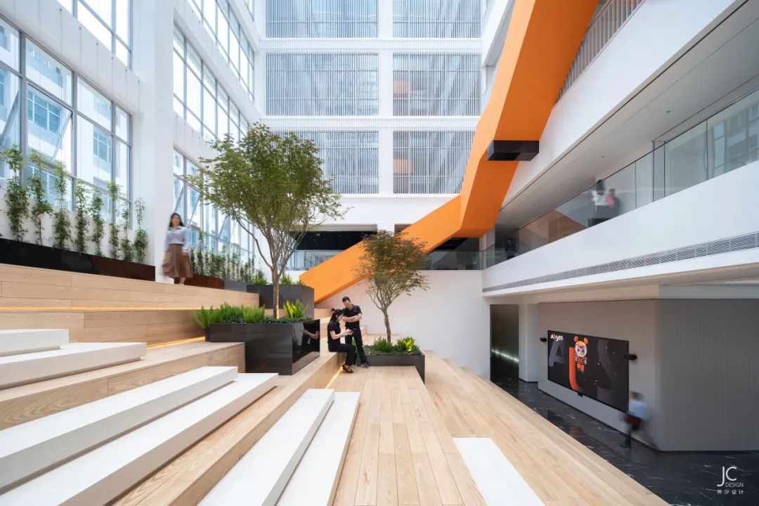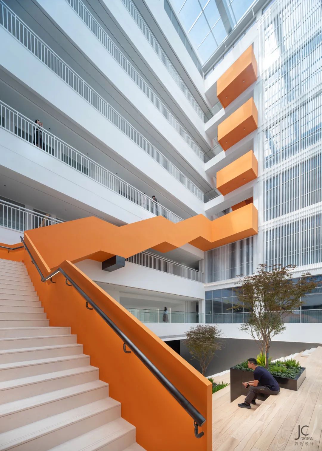 建筑内部设置的散步楼梯贯穿整个中庭形成垂直交通,大堂布置了大台阶式的休闲空间,倡导员工多步行运动,带动大堂充满活力的氛围,减少电梯乘坐频率,创造更多惬意休闲空间。