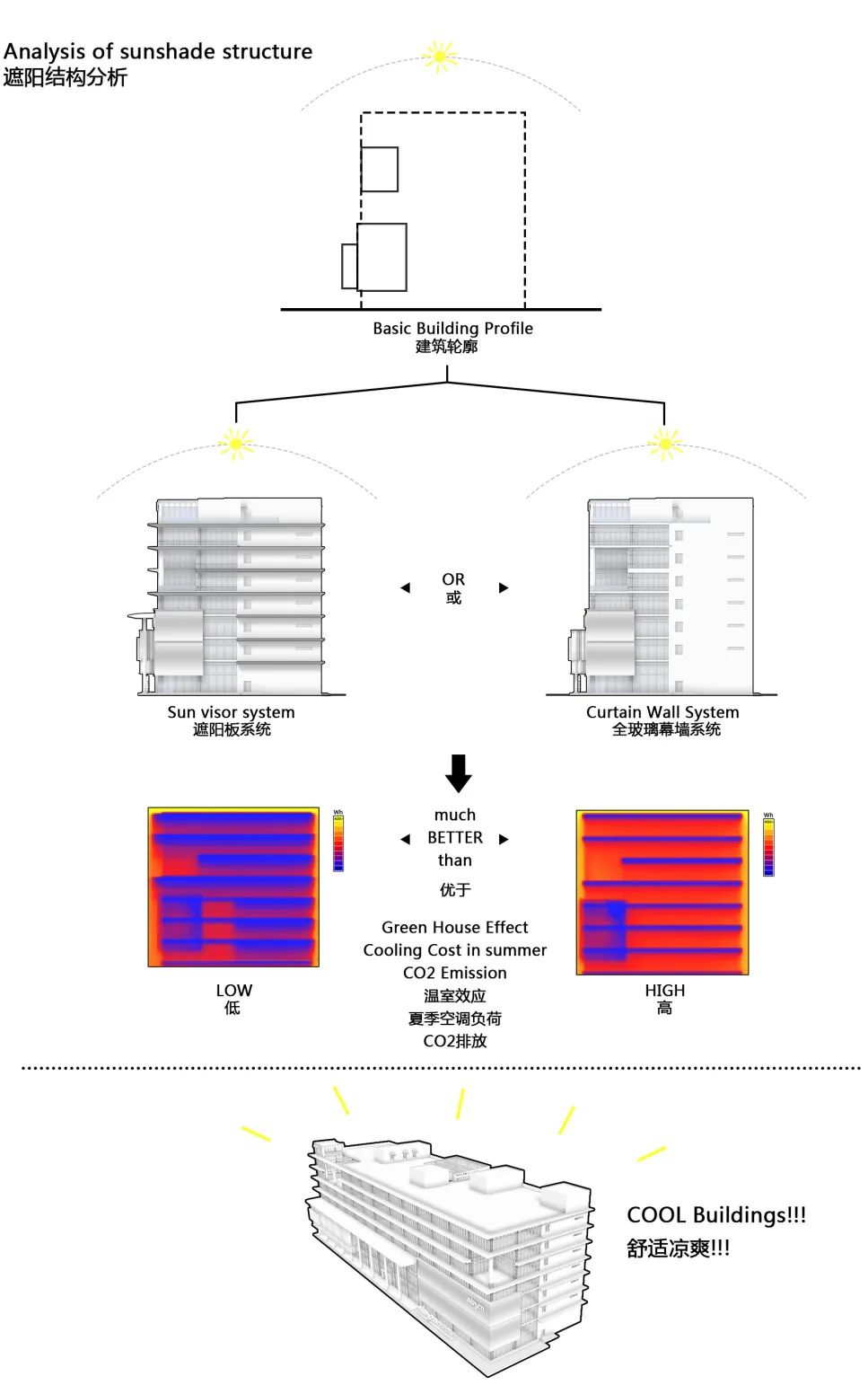 *建筑的太阳辐射分析数据显示,在所设计的铝遮阳板遮阳体系下,建筑太阳辐射约为326kwh/㎡,对比无遮阳板方案的543kwh/㎡,减少约40%