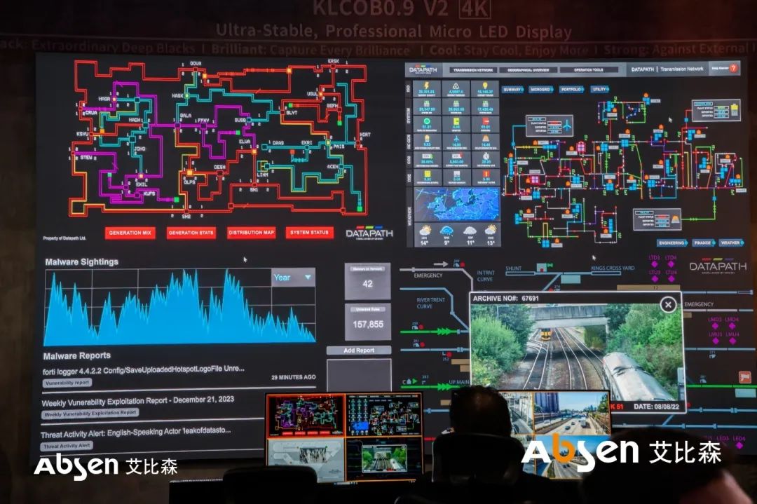 控制室场景重点展示KLCOB V2系列,该产品采用倒装COB技术,焊点减少40%+无引线设计,失效率直降50%,寿命提升100%;芯片直触PCB基板,散热效率大幅提升,能耗减少40%,运维成本降低50%;最大亮度可达1000nits,支持HDR、10.7亿色显与DCI-P3广色域,无惧环境干扰,画面鲜活逼真。产品通过EMC Class B认证,电磁辐射降低20%,长期使用安全无忧。