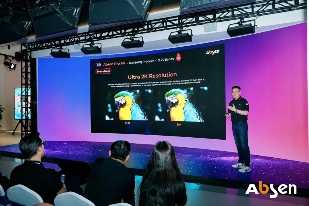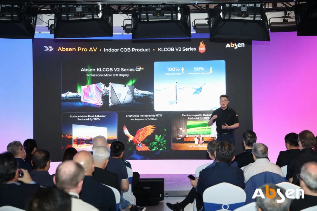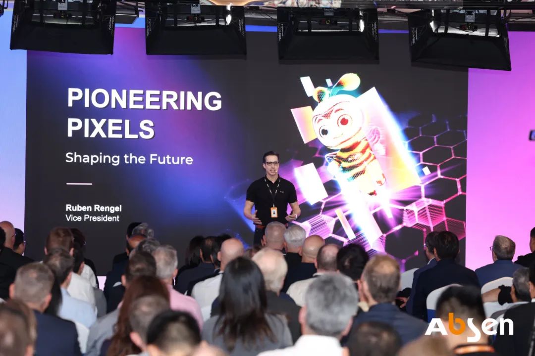 现阶段,LED显示屏正全面渗透到万亿级ProAV专业视听市场,成为商显、企业、娱乐、教育、安防等各类场景的主流之选。发布会上,艾比森国际销售体系总经理Sasha介绍了KLCOB V2系列、CPS系列等ProAV领域明星产品的核心技术特点与应用价值,并带来新品X V2系列的预发布,展示领先技术为全球ProAV市场带来的新的可能性。