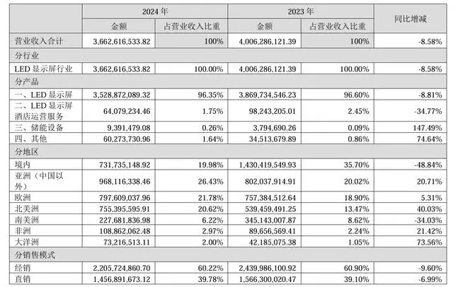 记者注意到,艾比森在2024年年初提出阶段性战略目标:公司2023年已实现签单约53亿元,力争2024年实现签单80亿元,2025年实现签单100亿元。但据年报,艾比森全年仅实现目标的五成左右,实现签单约42.56亿元,销售收入约36.63亿元,同比下降约8.58%。