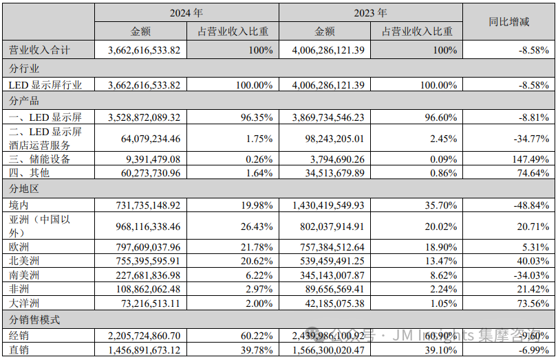 营业收入和净利润双下滑背后,是LED显示竞争日趋激烈的行业环境,同时也是艾比森在海外市场与国内市场之间策略调整的博弈。3月31日,艾比森发布2024年度业绩报告,报告显示公司2024年营业收入为36.63亿元,同比下降约8.58%;归属于上市公司股东的净利润为1.17亿元,比上年同期下降62.98%;扣除非经常性损益后的净利润为7589.69万元,比上年同期下降72.51%。与此同时,经营活动产生的现金流量净额为1.53亿元,同比下降71.18%;基本每股收益0.3192元,同比下降63.41%。截至报告期末,公司总资产为36.73亿元,同比下降7.51%;归属于上市公司股东的净资产15.14亿元,同比增长5.54%。艾比森表示,公司经营业务的变化主要体现在国内外市场的表现差异。报告期内,海外市场实现了29.31亿元的营业收入,同比增长13.78%,表现出良好的增长态势,主要得益于多年的深耕和合理布局,增强了品牌竞争力。相较之下,中国市场受到经济环境和竞争态势的影响,营业收入为7.32亿元,同比下降48.84%。公司从聚焦规模扩张调整为选择价值客户进行深耕,显示出在国内市场的战略调整。财报显示,在全球 LED 显示屏提供商中,Absen 是品类组合布局最全的品牌之一,也是全球地域覆盖率最高的品牌之一。公司多年来不断深耕海外市场,成为中国品牌出海的优秀典型。回顾艾比森海外市场情况,公司海外营业收入已连续三年保持两位数增长,三年复合年均增长率(CAGR)高达 43%,欧洲、北美、亚非拉等区域的三年 CAGR 均超过 30%。但略显遗憾的是,其国内市场业务发展相对羸弱。受经济环境和竞争态势的影响,2024年国内市场的营收有所下降,但客户结构和经营质量逐步优化。财报显示,艾比森国内市场实现营业收入约为 7.32 亿元,较 2023 年同期下降约 48.84%。具体季度来看,艾比森在2024年前三季度均实现盈利,而在第四季度出现亏损,公司归母净利润亏约81万元,扣非净利润亏损超267万元。盈利能力方面,2024年公司实现毛利率27.48%,同比2023年下降1.53%。具体产品来看,贡献公司超九成营收的LED显示屏,营收同比下滑,毛利率同比减少0.78%。2024年其LED显示屏产品单价跌破1万元,来到0.99万元/平方米,而这一数字在2023年还维持在1.04万/平方米。虽然面临营收与净利润双下滑的压力,但不得不提的是,宏观经济周期波动与产业结构调整的影响交织,LED显示行业面临业务增速放缓与盈利水平承压的双重挑战,多家上市公司甚至陷入亏损。艾比森在财报中提到,公司在面对行业竞争挑战时,采取了积极的经营策略,如成本控制和定价策略优化,确保了毛利率的相对稳定。公司还持续加大对人才梯队和品牌营销的投入,以提升综合竞争力。