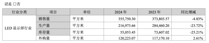 2024年,艾比森的主营产品出现产销齐跌的情况。2024年,公司LED显示屏的生产量和销售量分别为21.7万平方米、35.58万平方米,同比分别下滑23.72%、4.83%。同期,LED显示屏业务实现收入为35.29亿元,同比下滑8.81%。