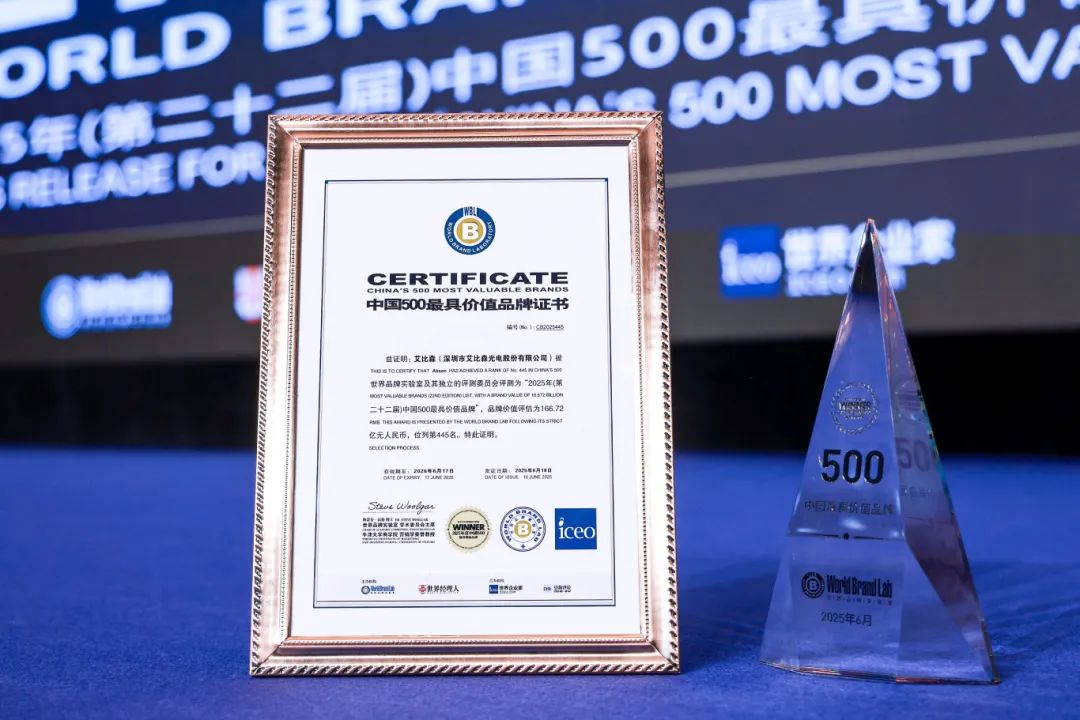 连续22年发布的《中国500最具价值品牌》榜单采用“收益现值法”,从财务数据、品牌强度及消费者行为分析等维度对品牌价值进行测算。再度入选“中国500最具价值品牌”,品牌价值稳步提升,不仅印证了艾比森在全球化竞争中的领先实力,更彰显了中国品牌向高端价值链跃升的标杆意义。