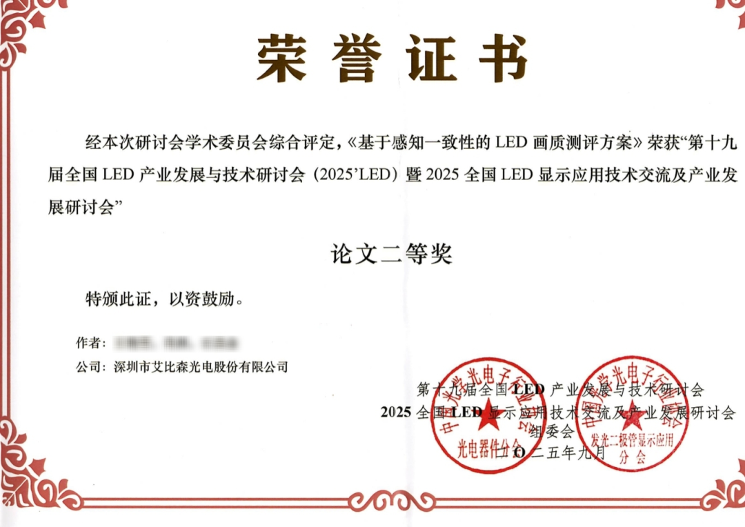 作为全球LED显示技术与应用领导品牌,艾比森提交的两篇学术论文《基于感知一致性的LED画质测评方案》和《面向大尺寸显示领域的Micro LED产业化路径:挑战与创新》获评本次大会“论文二等奖”。