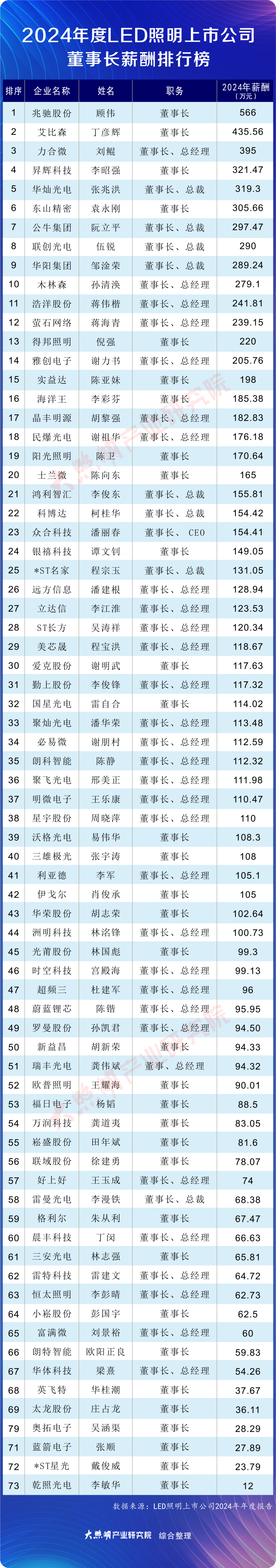 据大照明产业研究院不完全统计,在73位LED照明上市公司董事长中,丁彦辉以435.56万元的年薪高居第二位,仅次于 兆驰股份 董事长顾伟566万元年薪。此外, 力合微 、 昇辉科技 、 华灿光电 、 东山精密 等企业掌门人的年薪均超过300万元。