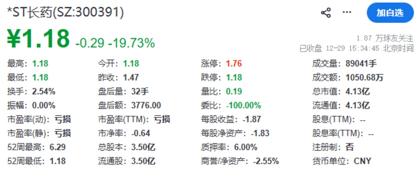今日,*ST长药(长江医药控股股份有限公司,股票代码300391.SZ)竞价阶段即封死跌停,股价报1.18元/股,总市值仅剩4.13亿元。