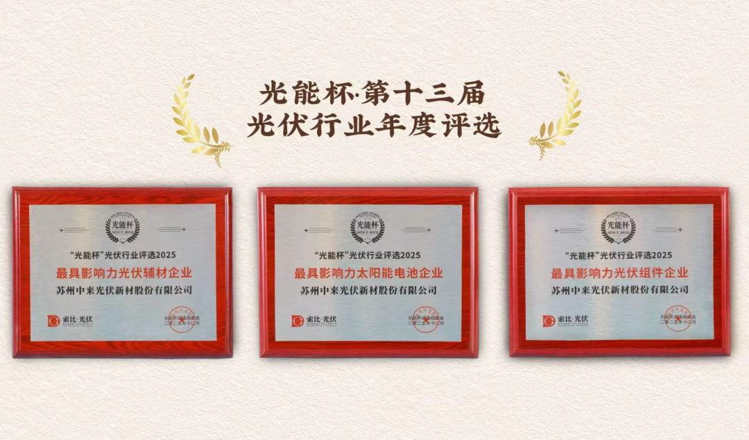 当晚,第十三届“光能杯”光伏行业颁奖盛典隆重举行,作为光伏行业公认的“年度奥斯卡”,“光能杯”评选以严苛的数据评审、行业调研与专家评议著称,是企业综合实力与创新能力的权威见证。中来股份凭借其在技术研发、产品可靠性与全产业链协同上的卓越表现,连续第三年同时斩获三项重量级大奖,成为本届盛典中备受瞩目的行业标杆。中来股份旗下三大业务板块再度获得高度认可:泰州中来光电获“2025年度最具影响力光伏组件企业”,苏州中来新材获“2025年度最具影响力光伏辅材企业”,山西中来光能获“2025年度最具影响力太阳能电池企业”。
