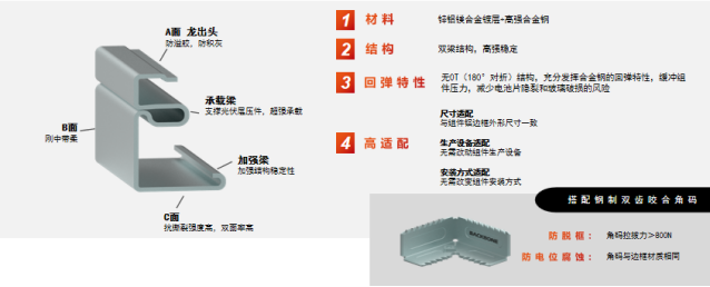 结构突破方面,御风组件采用双梁型合金钢边框,融合锌铝镁镀层与高强合金钢基材,创新运用“无0T(180°对折)”结构,充分发挥钢材回弹特性,有效缓冲应力。其强度达传统铝边框3倍,抗撕裂性能提升78%,且完全兼容现有产线与安装体系,实现“高强不减配”。