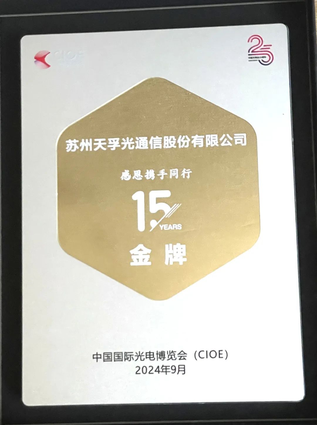 在这一值得纪念的夜晚,天孚通信因其长期的贡献和卓越表现,荣获了光博会颁发的金牌纪念奖章,这是对其超过15年不懈支持和合作的肯定。天孚通信,一如既往,携手光博会,共同见证了这一辉煌时刻。