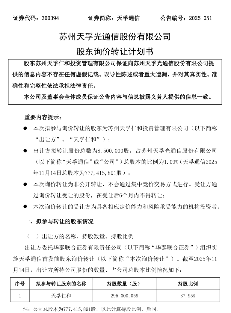公告称,此次询价转让股份的数量为850万股,占天孚通信总股本的比例为1.09%,转让原因为自身资金需求。截至公告发布日,天孚仁和持有天孚通信股份2.95亿股,持股比例为37.95%。