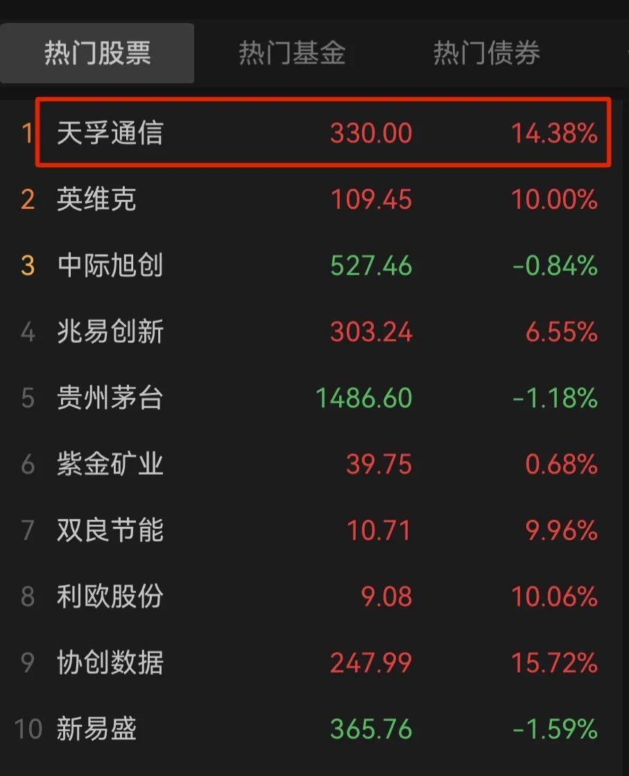 消息一出,市场反应剧烈。2月12日,天孚通信大幅高开,盘中震荡走高,一度触及333.79元/股,收盘报330.00元/股,单日大涨14.38%,股价再创新高,成为当日wind热股排行股第一