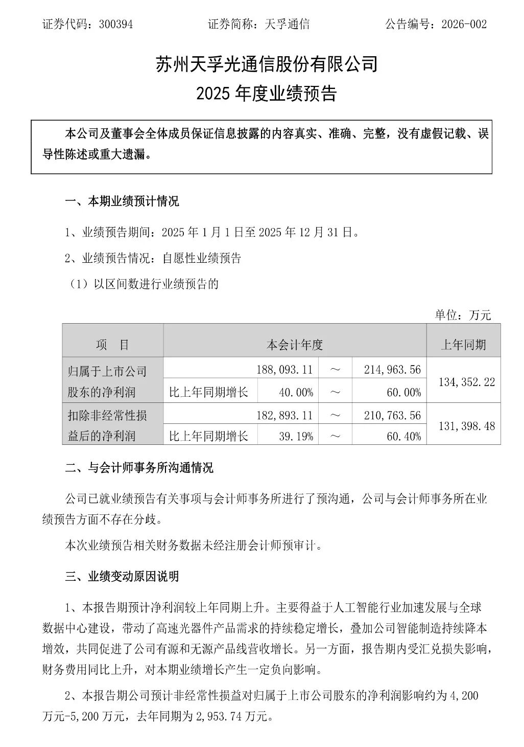 业绩层面,天孚通信交出了一份亮眼的成绩单。公司2025年度业绩预告显示,全年归母净利润预计18.81亿元至21.5亿元,同比增长40%—60%。