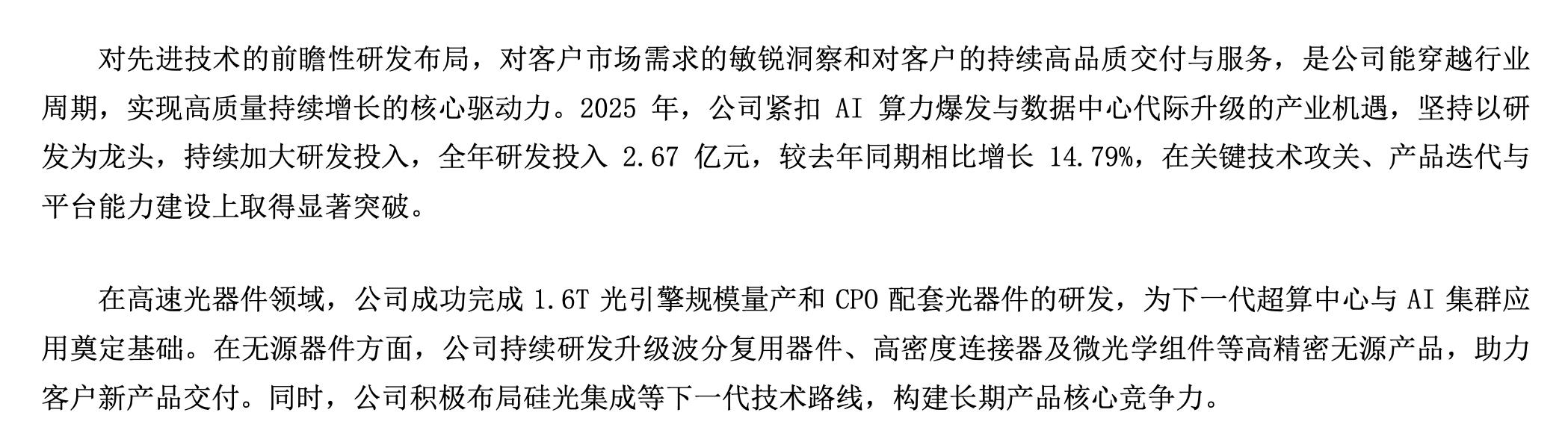 在高速光器件领域,公司成功完成1.6T光引擎规模量产和CPO配套光器件的研发,为下一代超算中心与AI集群应用奠定基础。在无源器件方面,公司持续研发升级波分复用器件、高密度连接器及微光学组件等高精密无源产品,助力客户新产品交付。同时,公司积极布局硅光集成等下一代技术路线,构建长期产品核心竞争力。