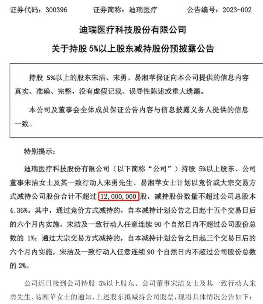 2023年1月3日,迪瑞医疗发布公告称,因股东自身资金需求,公司董事宋洁女士及其一致行动人宋勇先生、易湘苹女士计划以竞价或大宗交易方式减持公司股份合计不超过1200万股,减持股份数量不超过公司总股本4.36%。