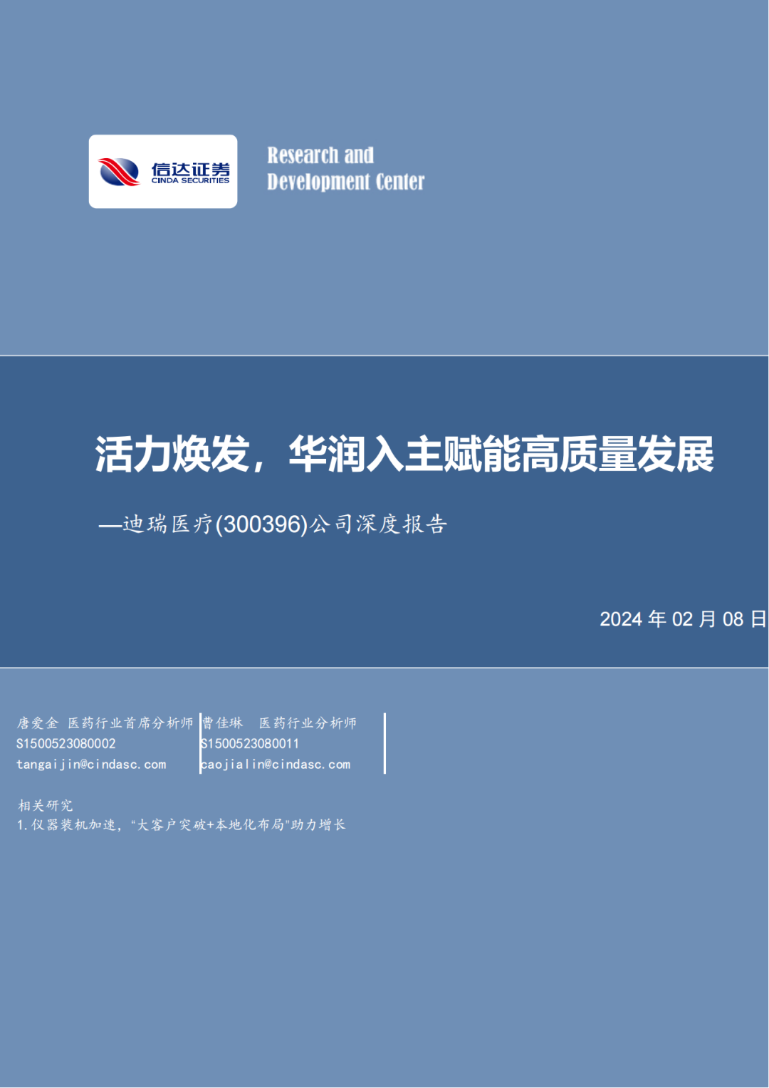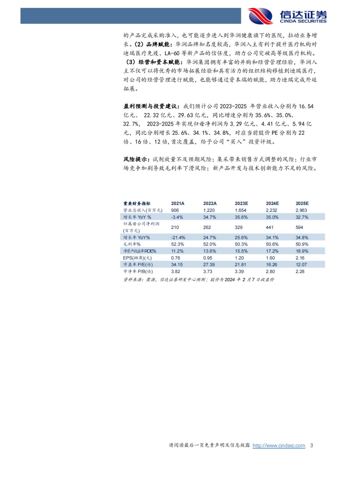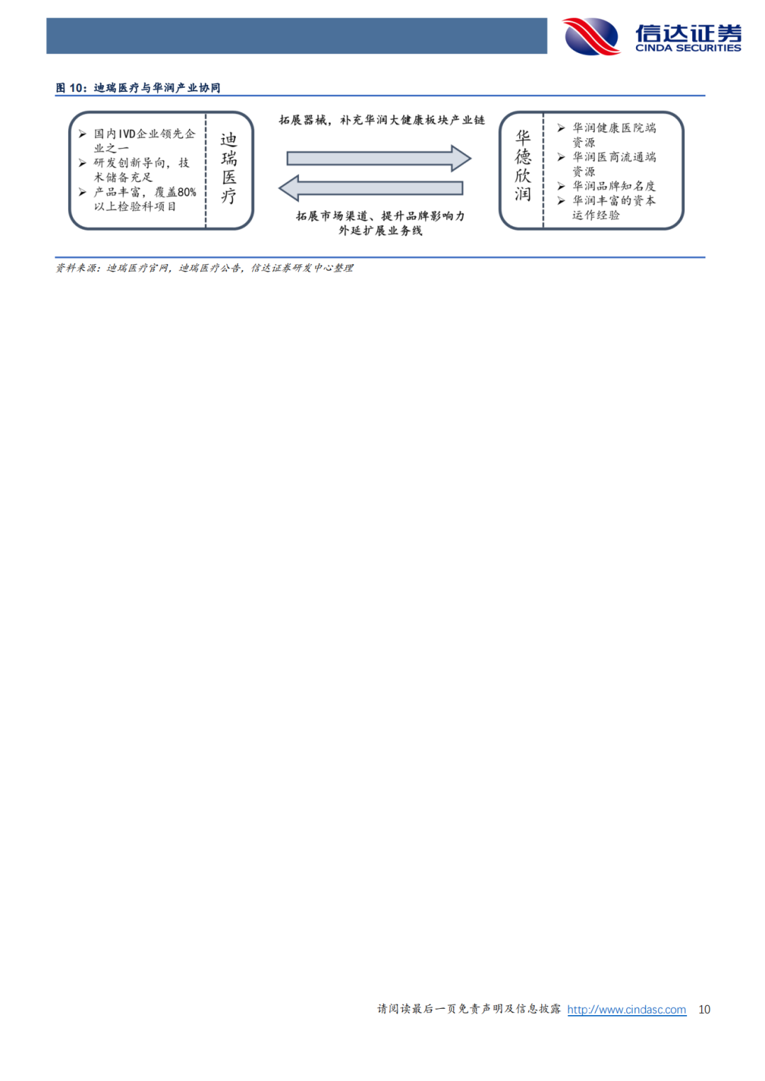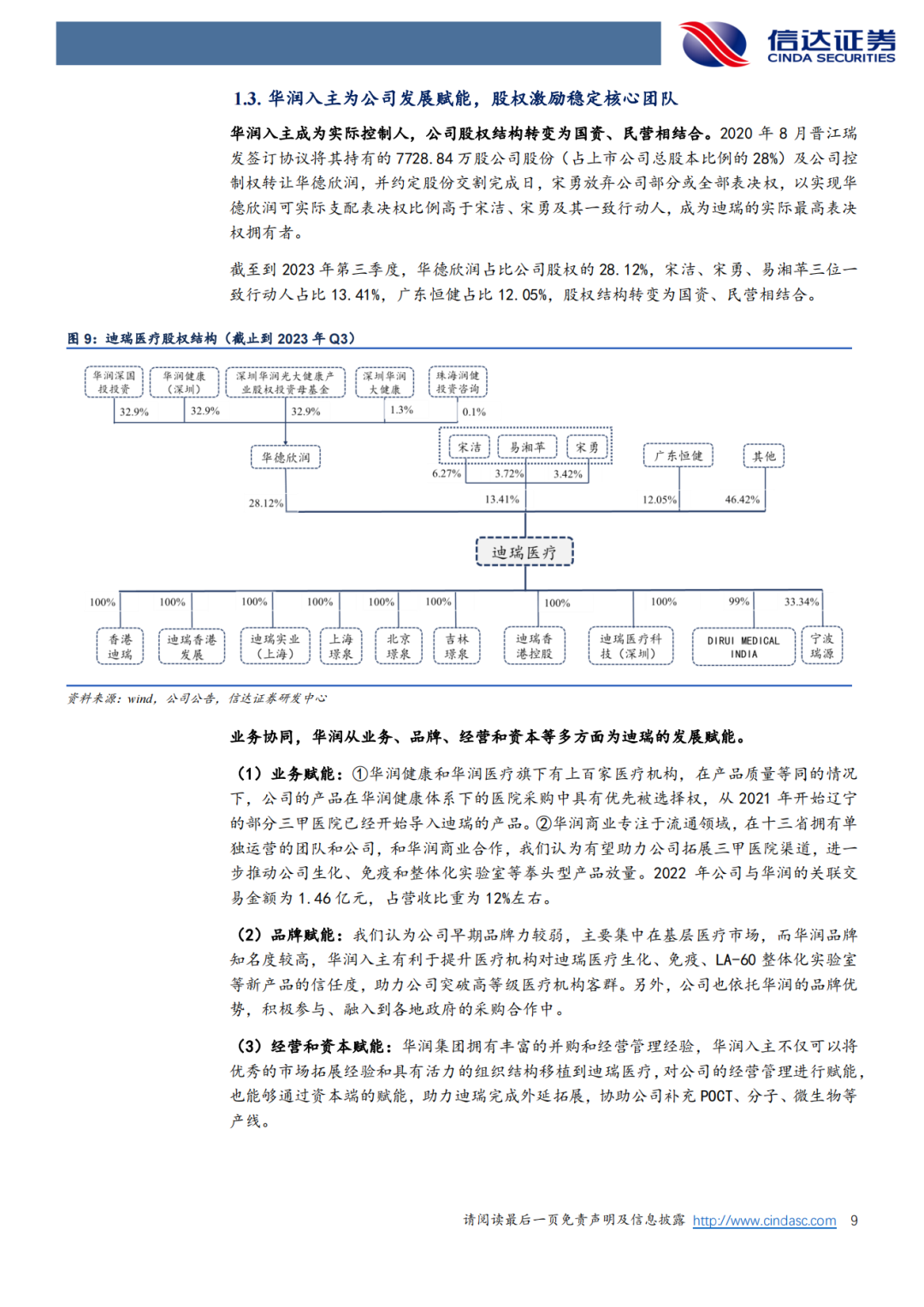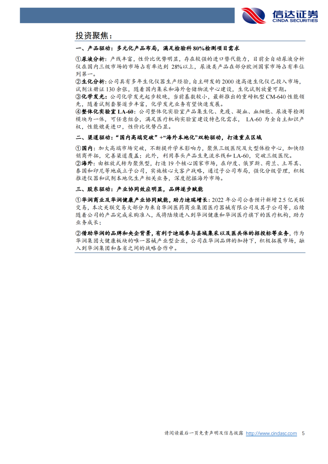 2022年,迪瑞医疗是华润集团大健康板块的唯一器械产业型企业,我们认为华润入主后,为公司业务拓展、品牌建设、外延发展等方面赋能,迪瑞进入新发展期。(1)业务赋能:公司作为老牌的医疗器械企业,产品能力较强,华润集团大健康板块中的其他公司能与公司形成良好的产业协同,随着公司的产品完成采购准入,也可能逐步进入到华润健康旗下的医院,拉动业务增长。(2)品牌赋能:华润品牌知名度较高,华润入主有利于提升医疗机构对迪瑞医疗免疫、LA-60等新产品的信任度,助力公司突破高等级医疗机构。(3)经营和资本赋能:华润集团拥有丰富的并购和经营管理经验,华润入主不仅可以将优秀的市场拓展经验和具有活力的组织结构移植到迪瑞医疗,对公司的经营管理进行赋能,也能够通过资本端的赋能,助力迪瑞完成外延拓展。