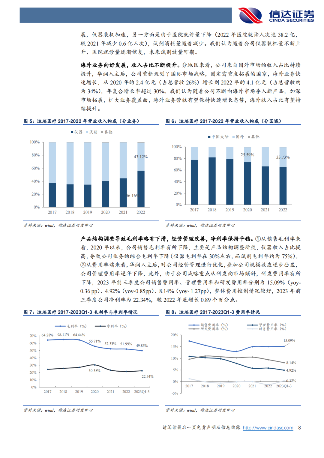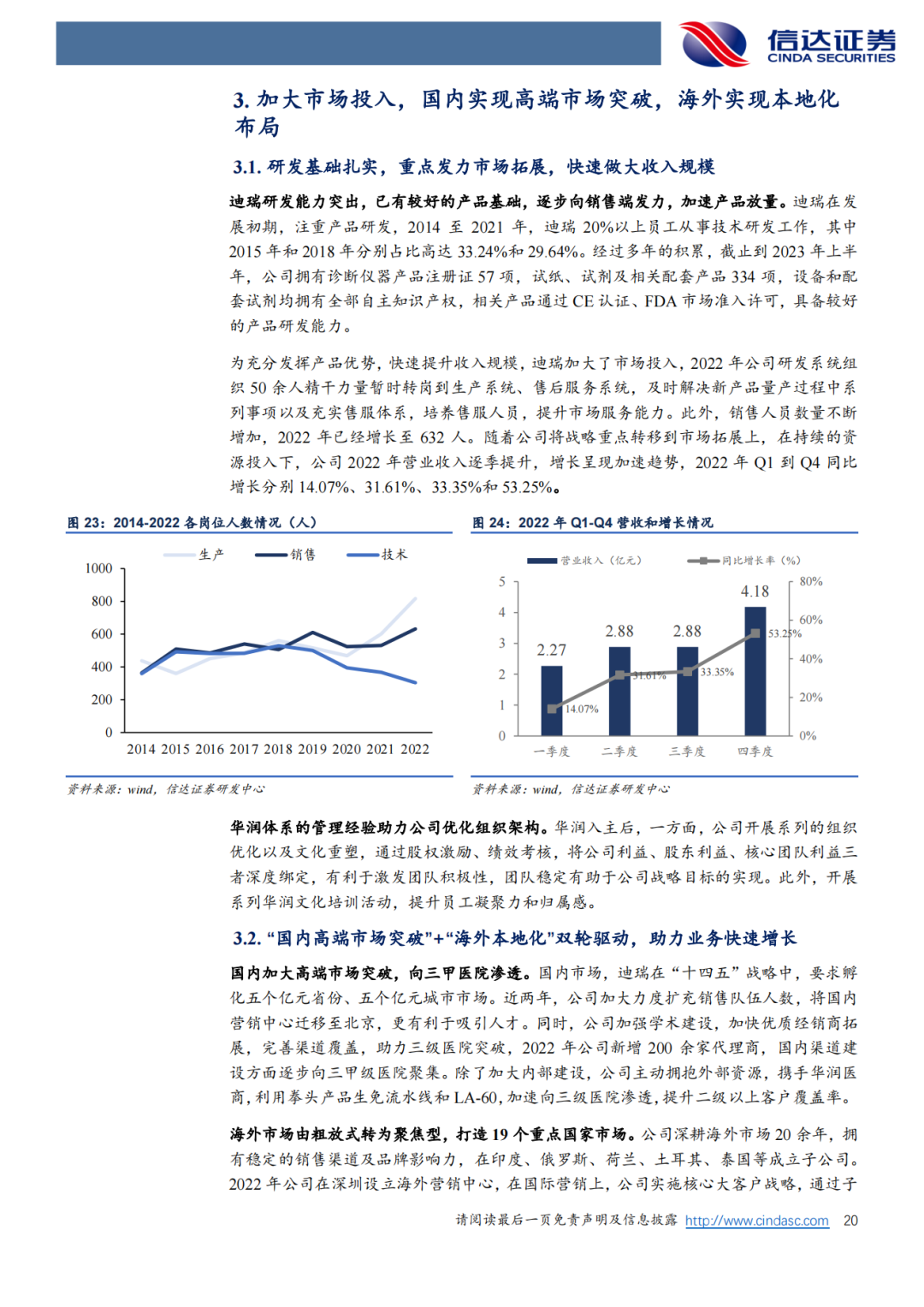 迪瑞在发展初期,注重产品研发,打下了坚实的产品基础,依托产品优势,公司逐步向销售端发力,推动产品放量。①加强售后服务能力,公司将一部分研发技术人员转岗到售后技术支持,提升市场服务能力,此外,销售人员数量不断增加,2022年已经增长至632人。②国内加大高端市场突破,公司不断提升学术影响力,聚焦三级医院及大型体检中心,加速优质经销商开拓,完善渠道覆盖;此外,利用拳头产品生免流水线和LA-60,助力三级医院突破。③海外市场由粗放式转为聚焦,打造19个重点国家市场,在印度、俄罗斯、荷兰、土耳其、泰国和印尼等国家成立子公司,实施核心大客户战略,通过子公司布局,强化分级管理,积极推进仪器和试剂本地化生产相关业务,深度挖掘海外市场。