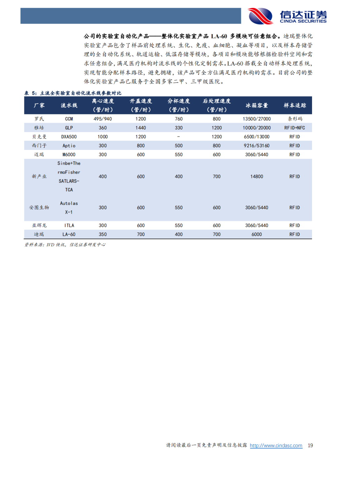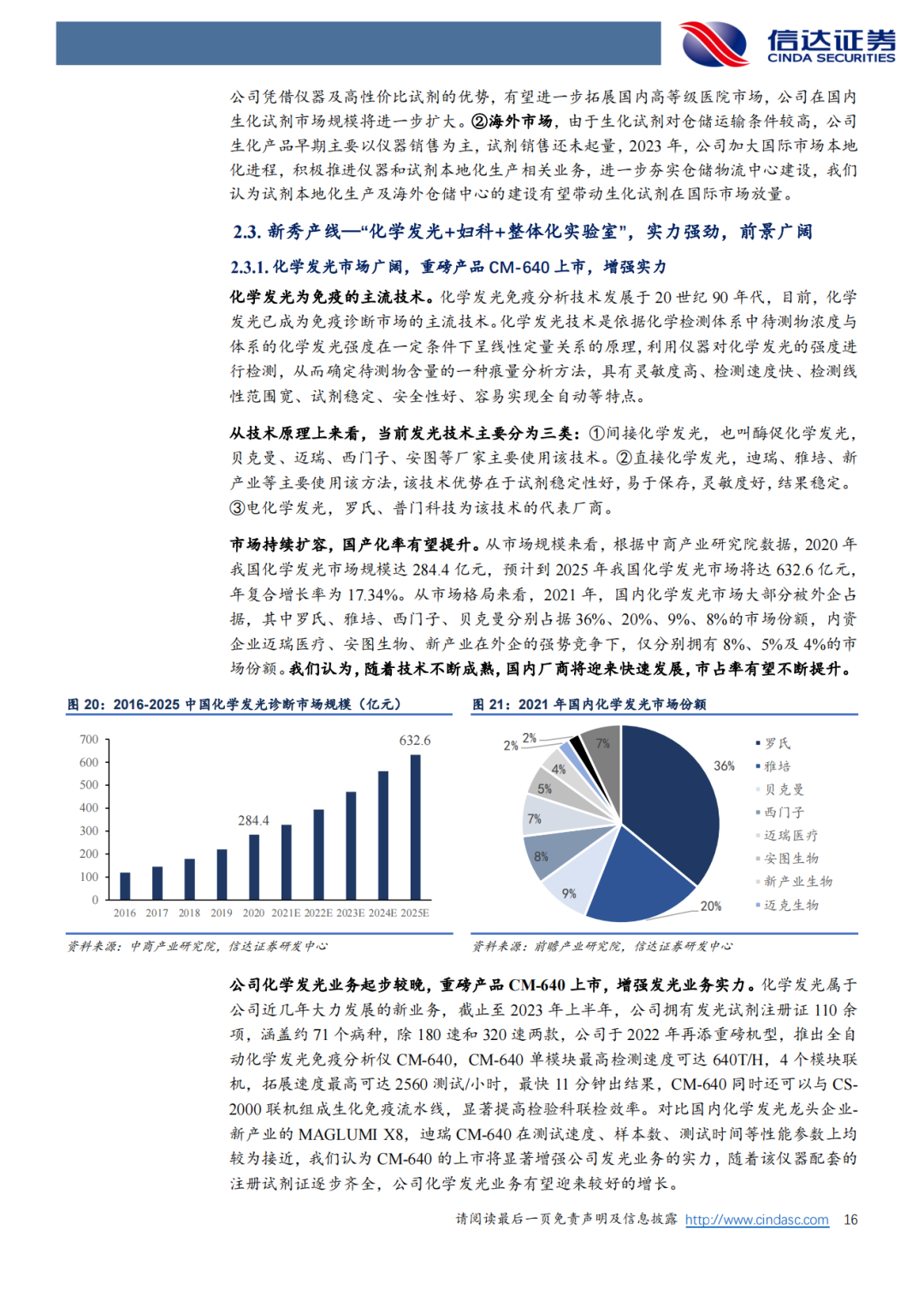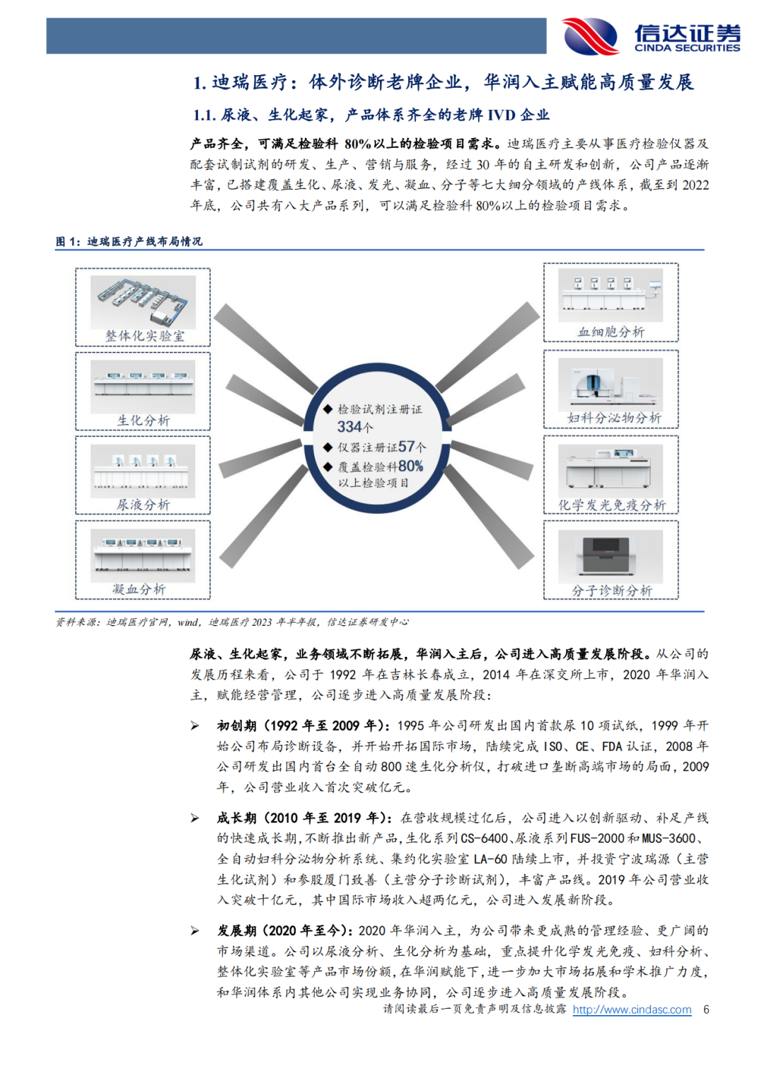 迪瑞医疗作为老牌IVD企业,产品管线丰富,现有产品涵盖七大细分领域,可满足检验科80%以上的检验项目需求。(1)“生化+尿液”业务稳健增长:①尿液领域,迪瑞研发能力较强,多个产品属于国内首家研发和上市的,仪器种类覆盖较全,性价比优势凸显,具有较强的进口替代实力,且在部分欧洲国家市场占有率位列第一。②生化领域,迪瑞有多年生化仪器生产经验,自主研发的2000速高速生化仪已投入市场,试剂注册证130余张,相较于国内其他生化厂商,公司仪器优势明显,随着国内集采推进和海外仓储物流中心建设,生化试剂放量可期。(2)“发光、妇科、LA-60”新产线市场前景广阔:①化学发光领域,公司起步较晚,当前基数较小,最新推出的重磅机型CM-640性能领先,随着试剂套餐逐步丰富,化学发光业务有望快速发展。②妇科分泌物领域,公司全自动妇科分泌物检测仪可自动加样、孵育、检测、结果判读,性能国内领先。③整体化实验室领域,公司整体化实验室产品LA-60集生化、免疫、凝血、血细胞、尿液等检测模块为一体,可任意组合,满足医疗机构实验室建设特色化需求,LA-60为全自主知识产权,关键性能上媲美进口,性价比优势凸显。