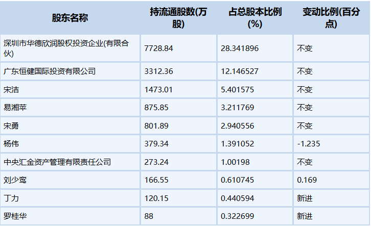 半年报显示,2025年上半年末的公司十大流通股东中,新进股东为丁力、罗桂华,取代了一季度末的博时医疗保健行业混合型证券投资基金、锐天158号私募证券投资基金。在具体持股比例上,刘少鸾持股有所上升,杨伟持股有所下降。