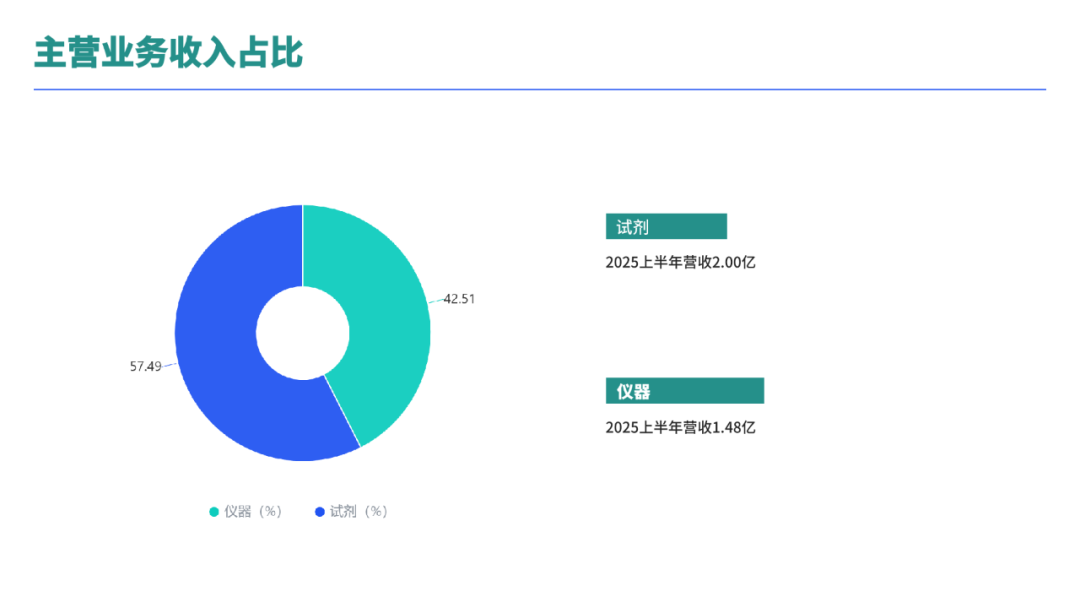 2025年上半年主营业务收入占比:试剂营收2.00亿占57.49%、仪器营收1.48亿占42.51%。