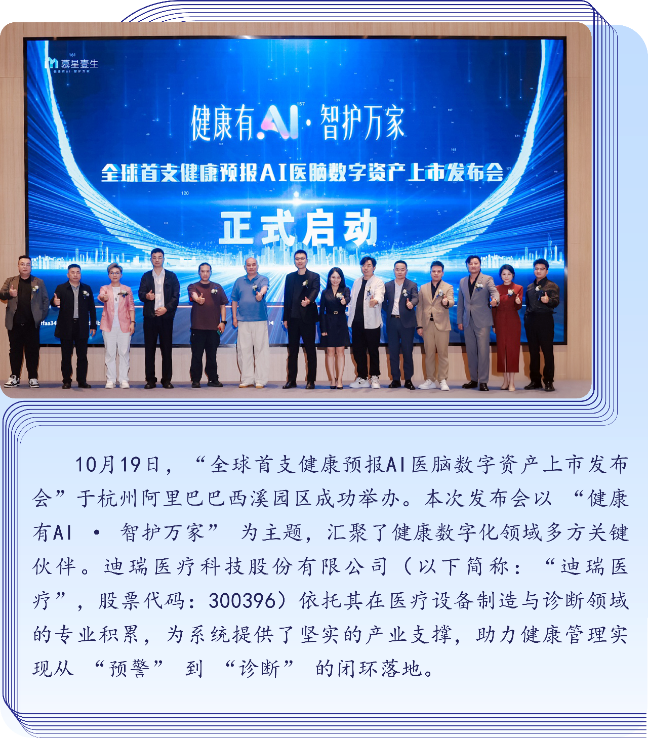 此次与“AI医脑数字资产项目”的合作,标志着迪瑞医疗成功从“诊断产品供应商”向“主动健康管理服务商”转型。未来,迪瑞医疗将继续深化技术创新,聚焦诊断产品与健康管理解决方案的优化升级,进一步助力医疗资源高效配置,提升全民健康管理水平,为“健康中国”建设注入专业力量!