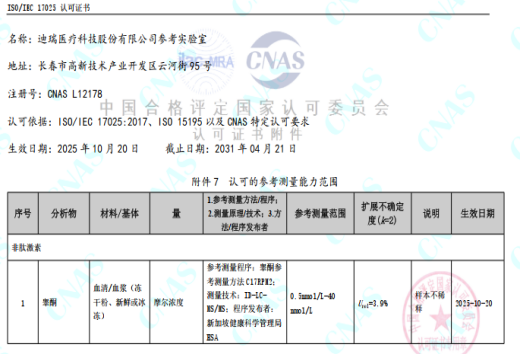 2020年9月9日,经过迪瑞医疗持续拓展认可范围,其血细胞领域WBC、RBC、HCT、PLT、HGB等5个项目通过扩项认可,进一步丰富了公司在体外诊关键项目上的溯源能力。在2025年8月16日参考实验室第5次通过现场评审,同时新增非肽激素类化学发光睾酮(T)项目认可扩项,截至目前,迪瑞共拥有16个项目通过CNAS参考实验室认证,成为国内体外诊断少数拥有多领域、多项目CNAS认可的企业之一。