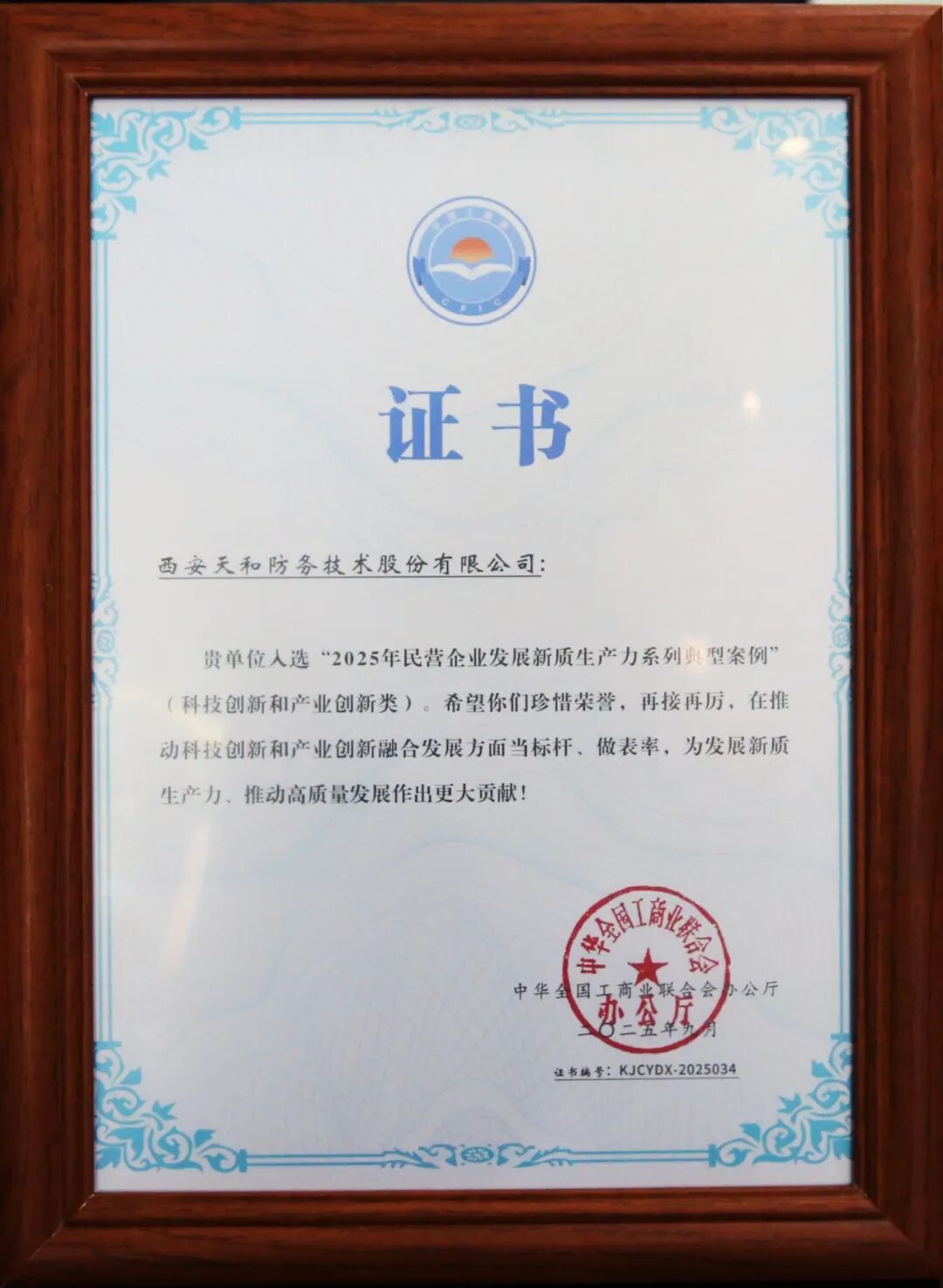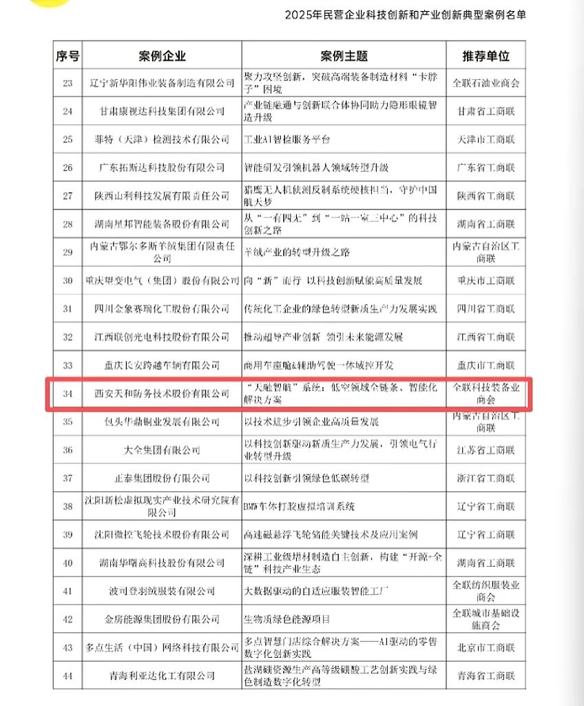 会上,全国工商联发布了《2025年民营企业科技创新和产业创新典型案例名单》。西安天和防务技术股份有限公司入选“2025年民营企业发展新质生产力系列典型案例”,公司“‘天融智航’低空领域全链条、智能化解决方案”获评“2025年民营企业科技创新和产业创新典型案例”名单。