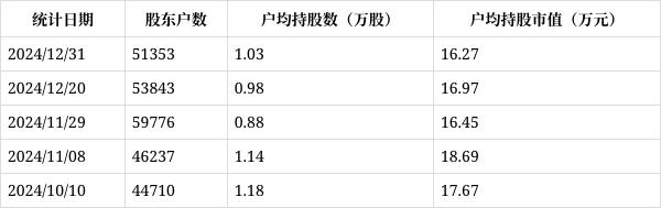 从1月20日公开信息显示,飞凯材料截至2024年12月31日公司股东户数为5.14万户,较上期(2024年12月20日)减少2490户,降幅为4.62%,变化不大。