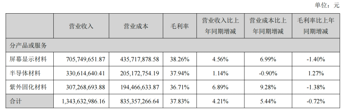 然而,细究财务数据,证券之星注意到,为公司贡献过半营收的屏幕显示材料板块,正面临盈利能力下滑的压力。由于营业成本增速高于营收增速,该板块毛利率同比下降1.4个百分点至38.26%。同样,紫外固化材料毛利率也同比下降1.38个百分点至36.71%。