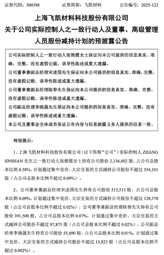 然而,正当其业绩与股价的双双飙升之际,飞凯材料发布了一则高管减持计划公告,为这轮上涨行情蒙上了一层阴影。
