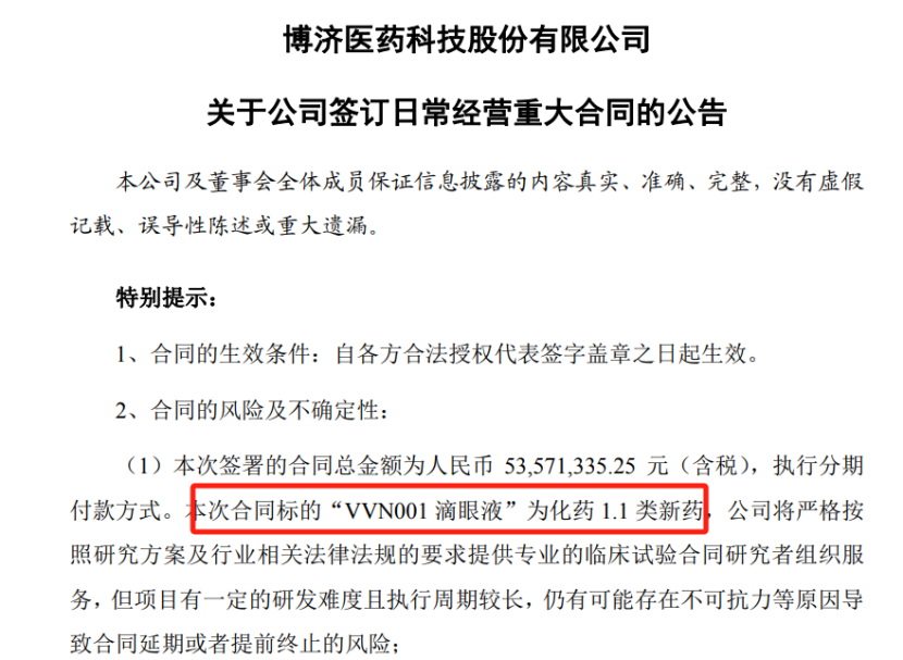 1月26日,博济医药科技股份有限公司披露了关于公司签订日常经营重大合同的公告。博济医药与维眸生物科技(浙江)有限公司签订了《临床试验服务协议》,合同总金额为5357.13万元,合同约定维眸生物委托博济医药提供“VVN001 滴眼液”临床试验合同研究者组织服务。