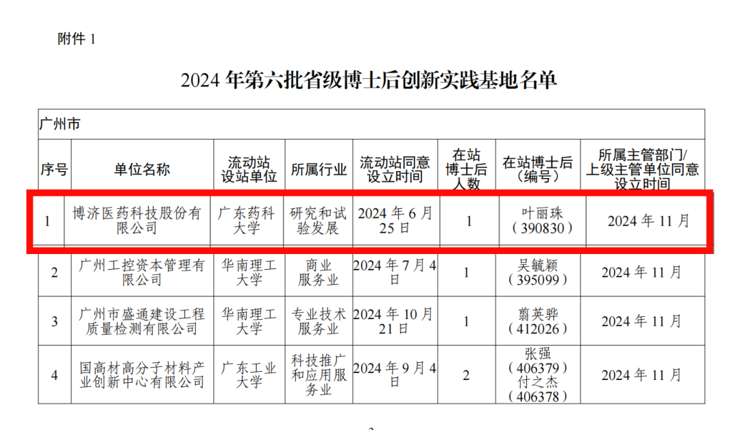 日前,广东省人力资源和社会保障厅发布《关于公布2024年第六批省级博士后创新实践基地备案及动态调整情况的函》,博济医药榜上有名,成功获批设立广东省博士后创新实践基地。