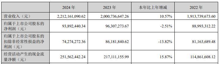 2024年,公司实现营业收入22.12亿元,同比增长10.57%;归属于上市公司股东的净利润9389.24万元,同比下降2.51%;归属于上市公司股东的扣除非经常性损益的净利润7427.43万元,同比下降13.82%;经营活动产生的现金流量净额为2.52亿元,同比增长15.87%。
