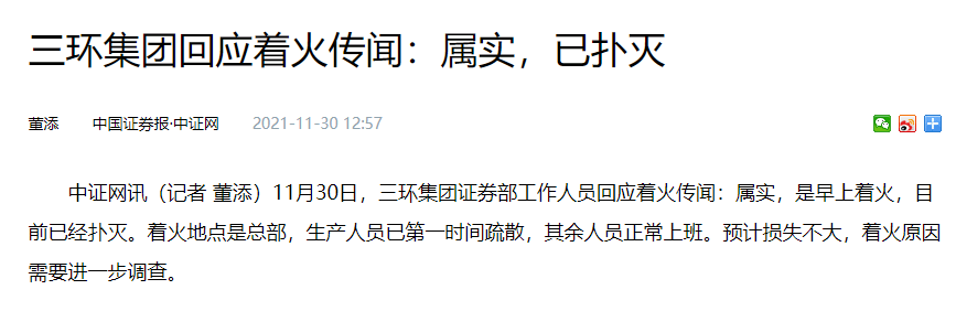 三环集团证券部工作人员回应着火传闻:属实,是早上着火,目前已经扑灭。着火地点是总部,生产人员已第一时间疏散,其余人员正常上班。预计损失不大,着火原因需要进一步调查。