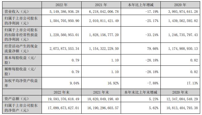 昨晚,三环集团发布2022年年度报告。2022年,三环集团实现营业收入51.49亿元,同比下滑17.19%;归属于上市公司股东的净利润15.05亿元,同比下滑25.17%;归属于上市公司股东的扣除非经常性损益的净利润12.21亿元,同比下滑33.24%;经营活动产生的现金流量净额20.74亿元,同比增长79.66%。