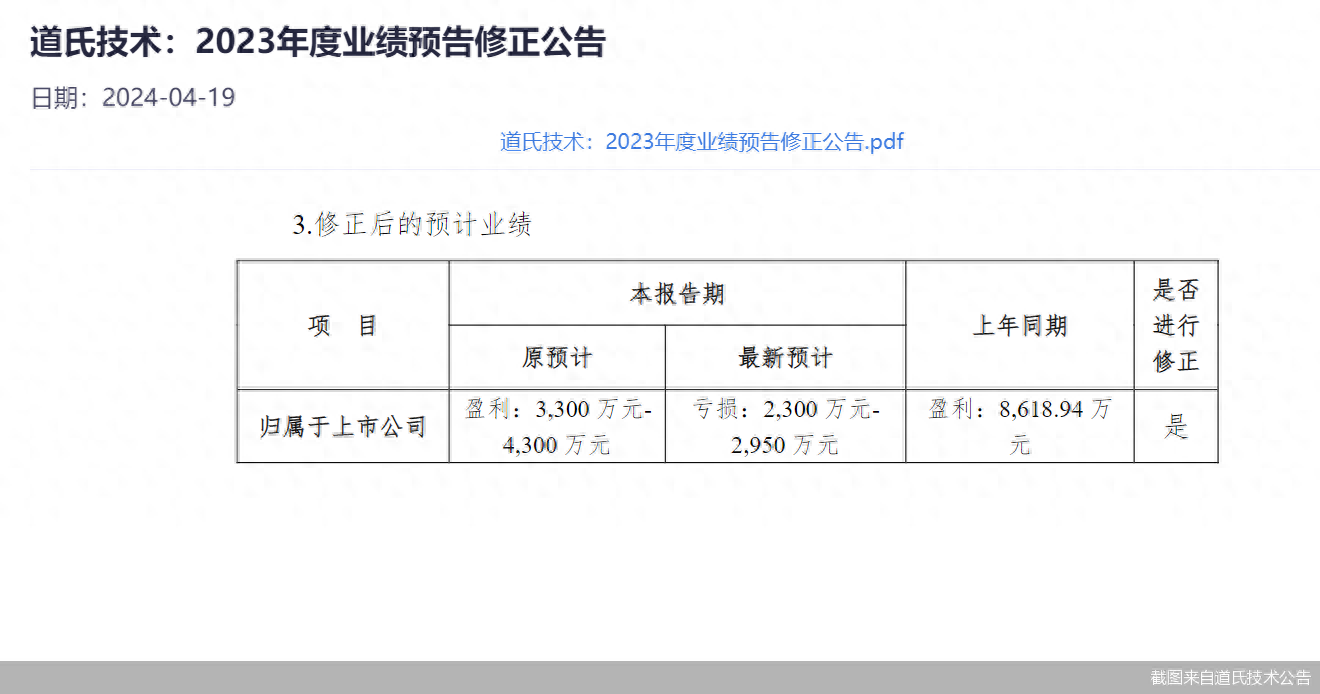 继鸿博股份之后,A股市场又有上市公司业绩“变脸”,盈亏性质发生变化。4月19日晚间,道氏技术(300409)披露了2023年业绩预告修正公告,公司预计全年净利将出现亏损。