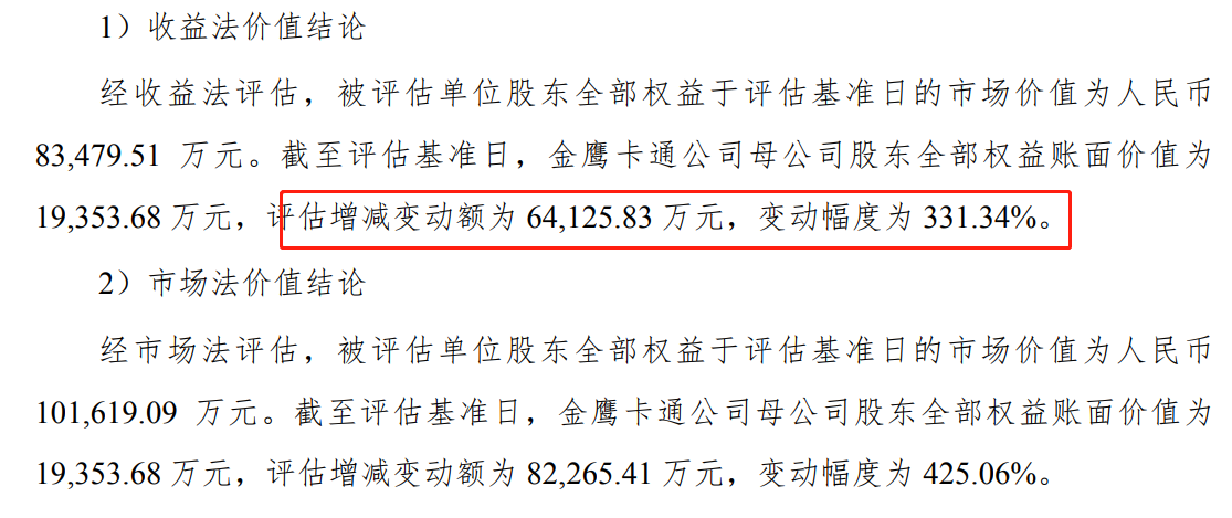 芒果超媒此次现金收购控股股东旗下金鹰卡通100%股权,构成了关联交易,且本次评估以收益法评估结果作为最终评估结论,即截至评估基准日,金鹰卡通公司股东全部权益价值为 8.35亿元,账面价值约为1.94亿元,评估增值约6.41亿元,增值率331.24%。