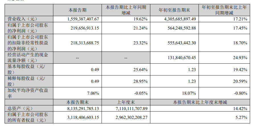 此外,伊之密此前披露的2025年第三季度报告显示:前三季度公司实现营业总收入43.06亿元,同比增长17.21%;归母净利润5.64亿元,同比增长17.45%;扣非净利润5.56亿元,同比增长18.70%。