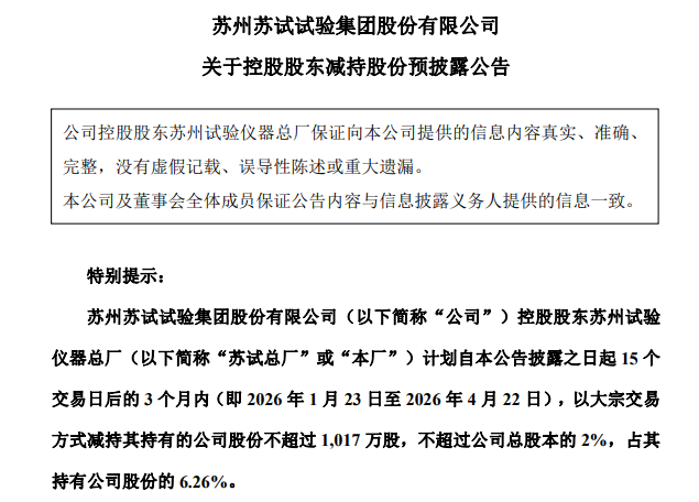 2025年12月31日,苏试试验(300416)公告,公司控股股东苏州试验仪器总厂(下称“苏试总厂”)计划在特定区间内减持公司股份。此次减持规模不超过1017万股,占公司总股本的2%,主要用于解决苏试总厂回购内部股东股份的资金需求。